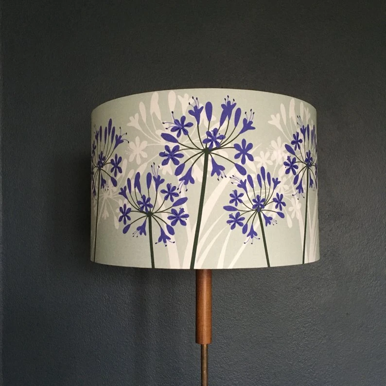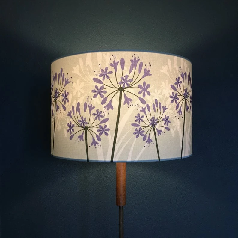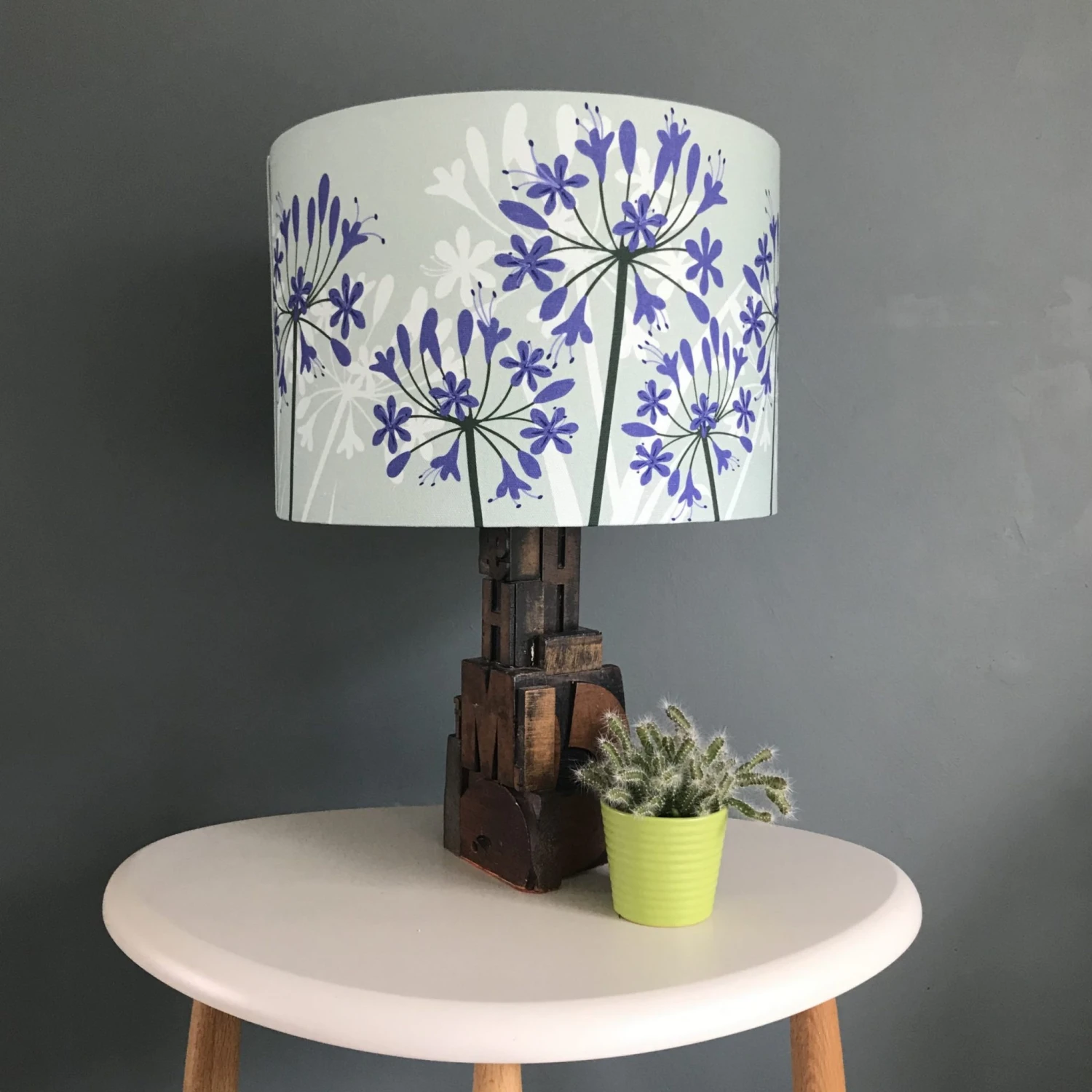 This Agapanthus lampshade shows the Agapanthus flower heads in a rich purple and against an eau de nil colour background. The interior lining is in a white finish.