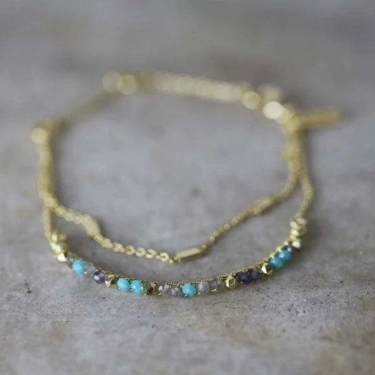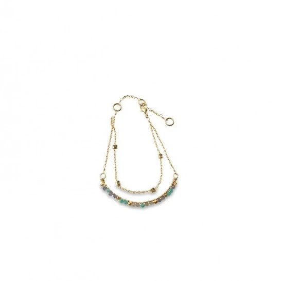 This exquisite Aja bracelet combines the natural stones of lolite, labradorite and calcydone with a 22-karat gold chain. This stunning design has a double strand design that sits beautifully on your wrist. Nkuku’s jewellery collections are handmade by a fair-trade enterprise in Rajasthan. The artisans used traditional techniques honed over generations.