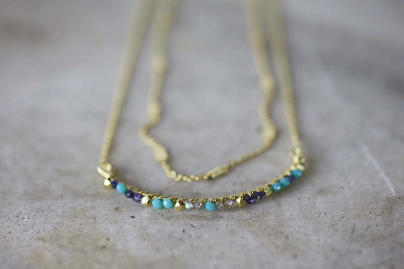 This exquisite Aja necklace combines the natural stones of lolite, labradorite and calcydone with a 22-karat gold chain. This stunning design has a double strand design that sits beautifully on your wrist. Nkuku’s jewellery collections are handmade by a fair-trade enterprise in Rajasthan. The artisans used traditional techniques honed over generations.