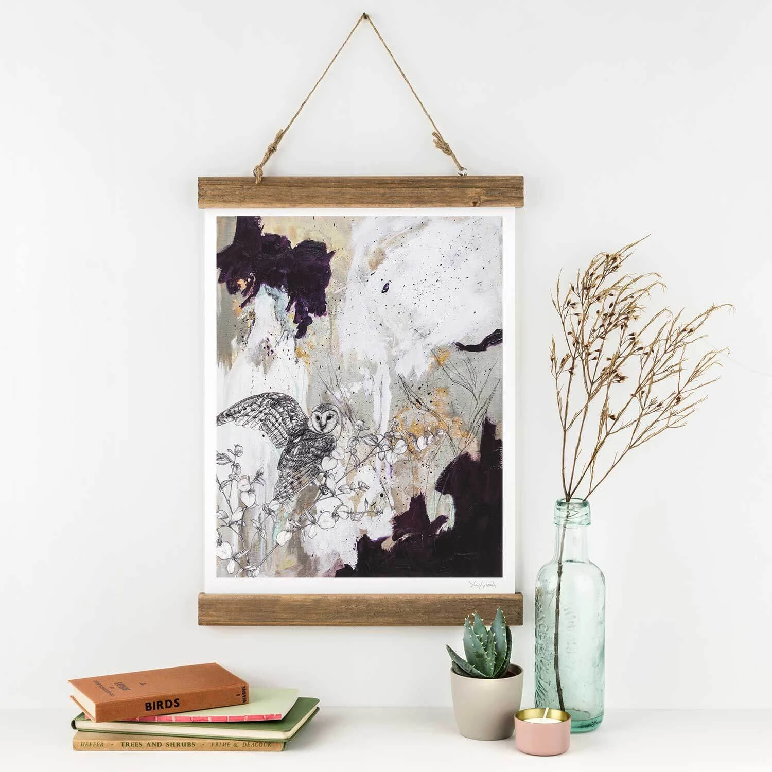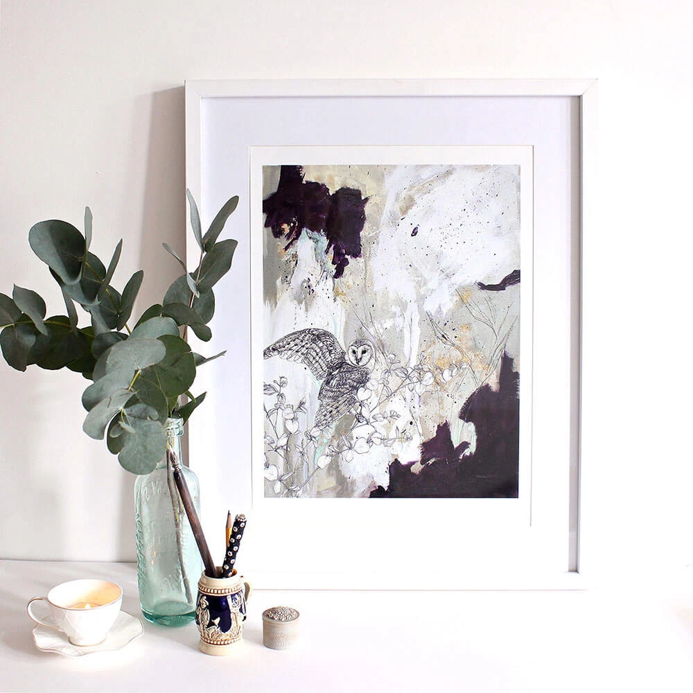 This is a stunning print of a barn owl perched among foliage over an abstract painted backdrop. It would make a beautiful addition to any home. The owl has been delicately illustrated by hand. It has then been digitally put together with an original painting which has also been created by Sky Siouki.