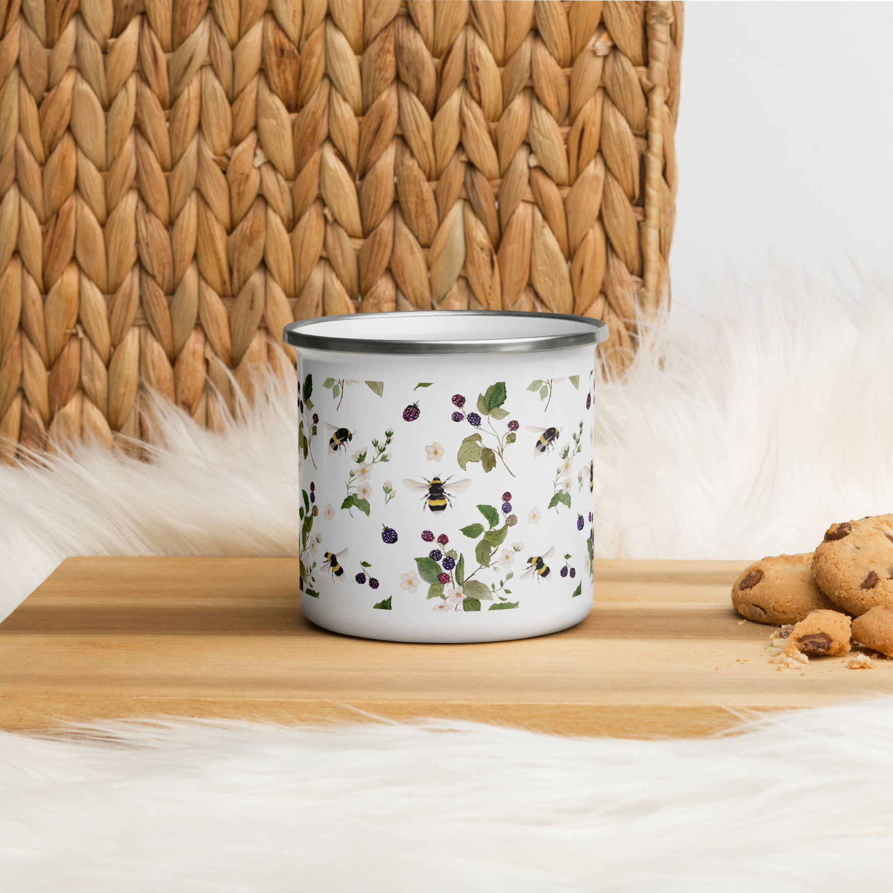 Camping essentials are never complete without an enamel mug, and this one is just perfect for nature or garden enthusiasts. Designed using original watercolour illustrations of white-tailed Bumblebees and bramble blossom arranged into this sweet pattern.