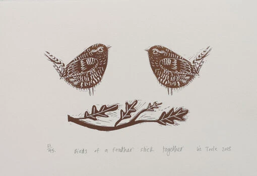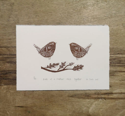 Limited edition hand printed Liz Toole screen print featuring two Wrens sitting in a tree.