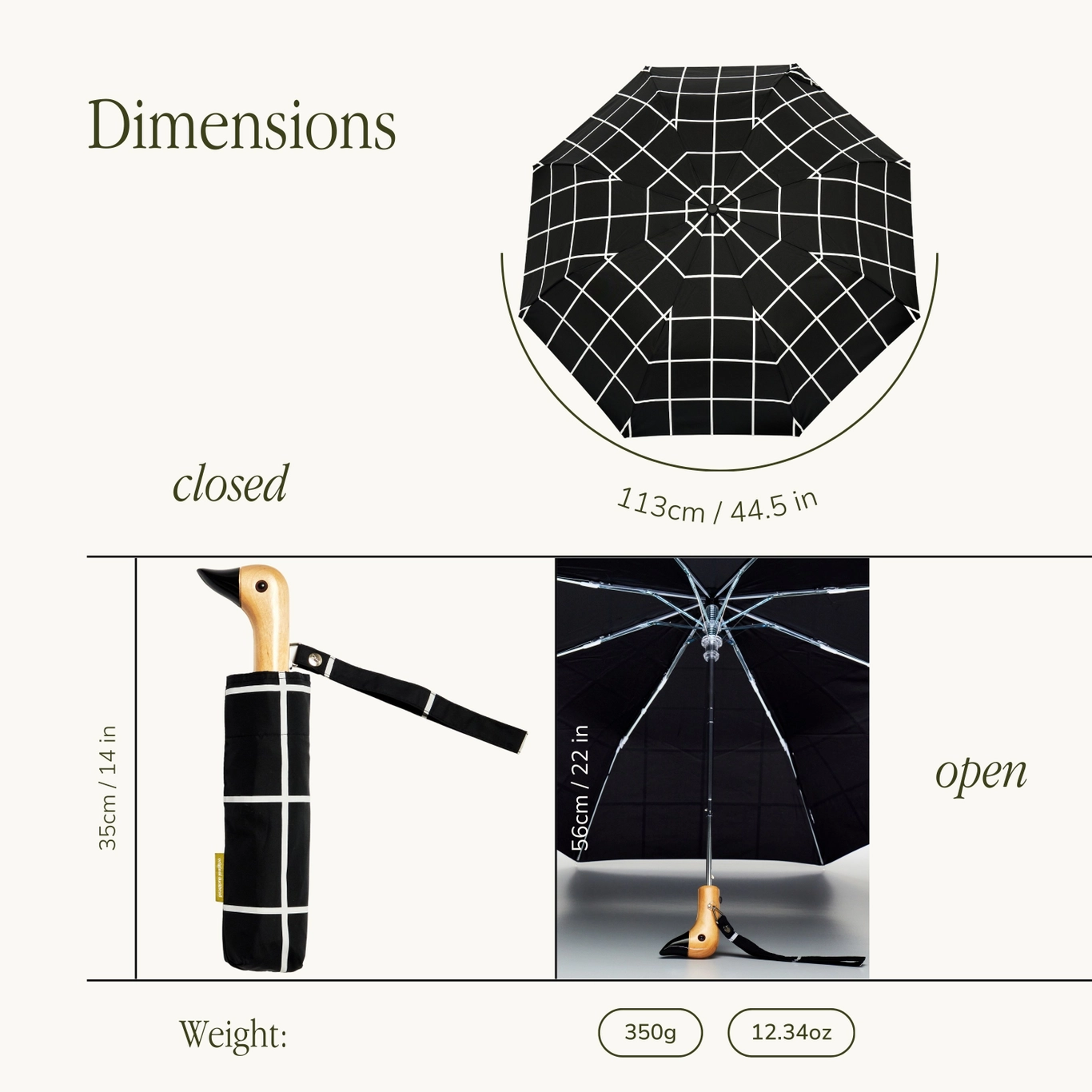 This lovely Black Grid compact umbrella from Original Duckhead is designed in London and handmade with care. These umbrellas are compact and eco-friendly as the fabric is made from 9 recycled plastic bottles.