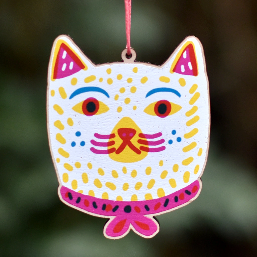 A charming cat wearing his best ribbon. Inspired by antique Staffordshire pottery cats. Cat wooden ornament threaded with a coloured string.