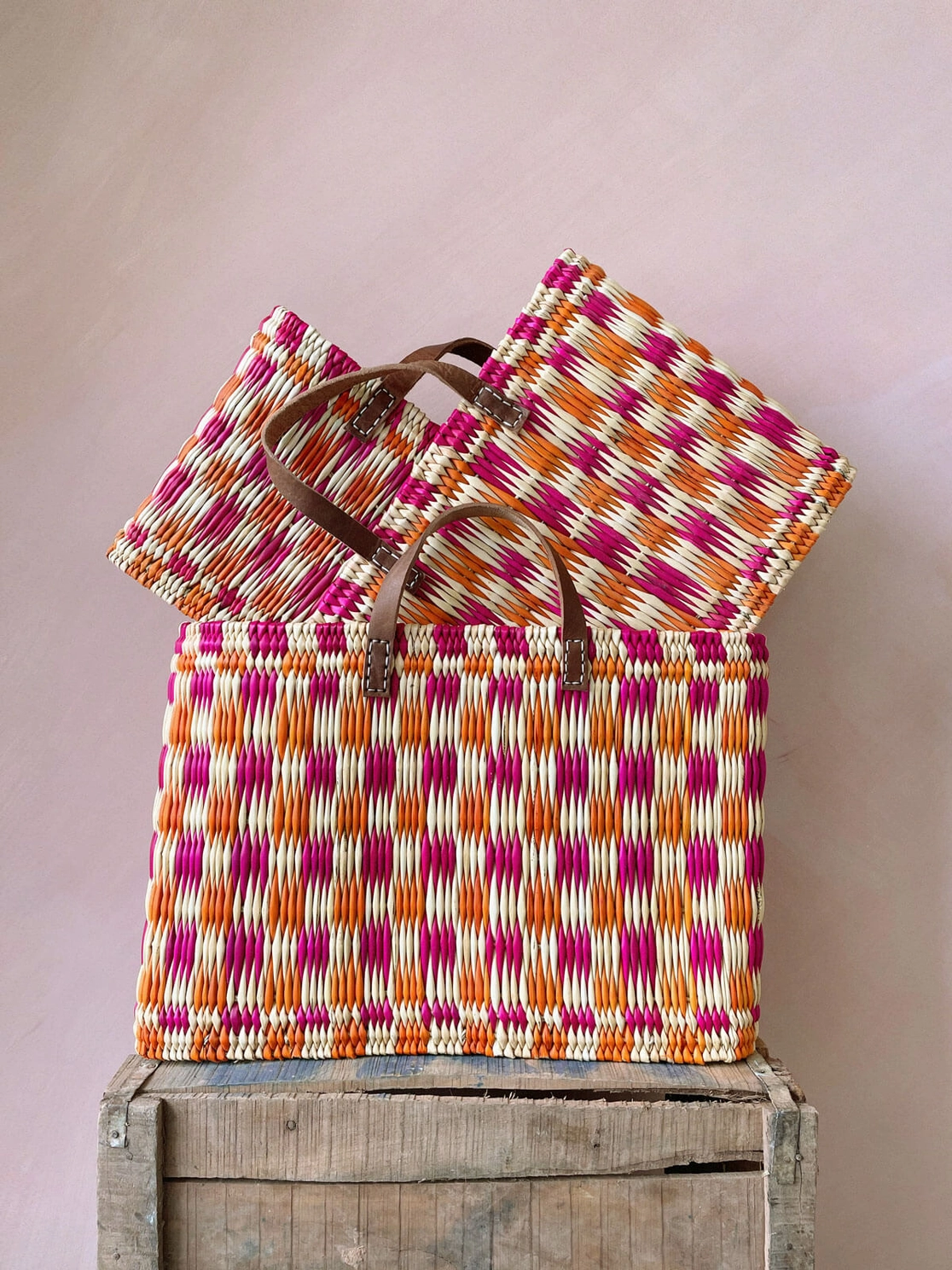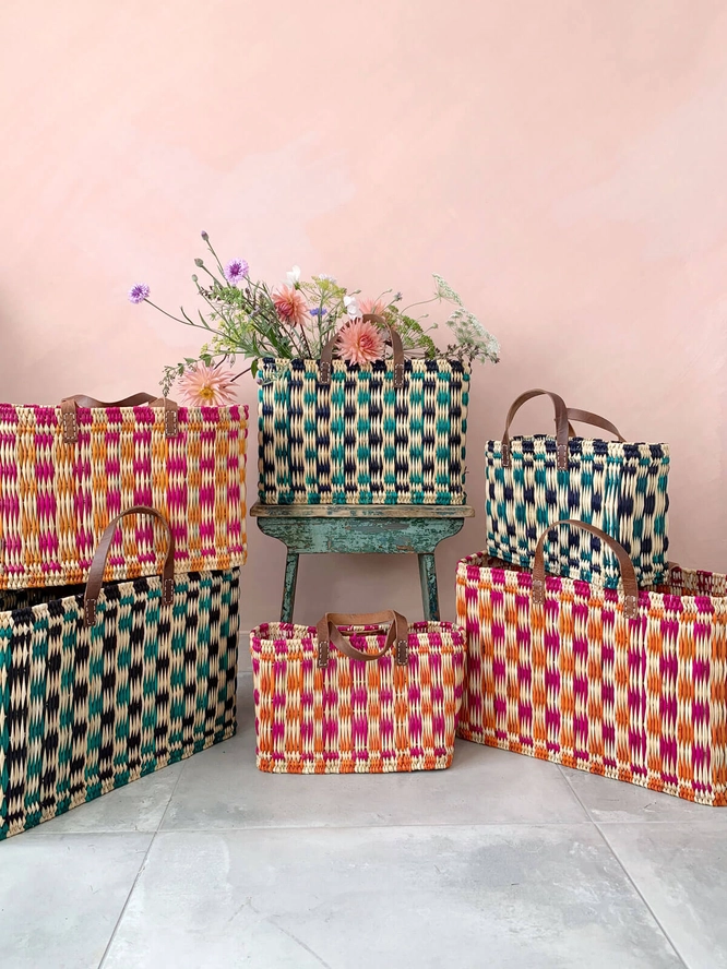 These striking Chequered Reed Baskets from Bohemia Design are woven by hand in the coastal regions of Morocco. These baskets are great for both home storage and as handy shoppers. This design has a naturally tanned leather handle which is stitched in our Marrakech workshop. A thoughtful birthday, Valentine’s Day or Mother’s day gift.