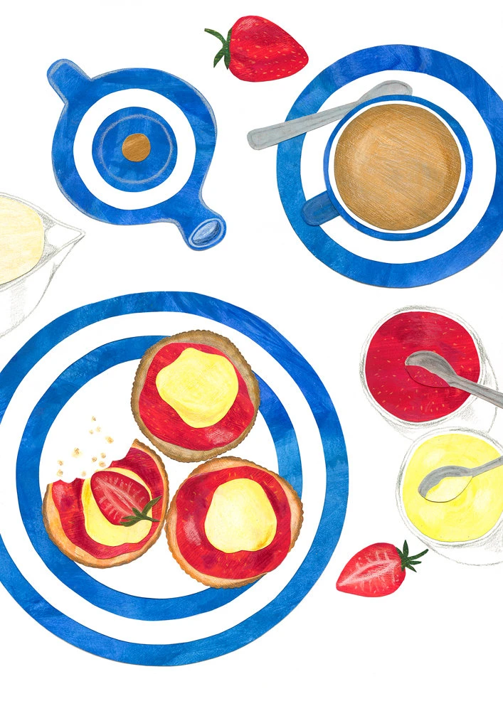 This lovely Cornish Cream Tea A4 Art Print is by graphic designer and illustrator Sarah Derry Wilson who created bright collages inspired by natural food and produce. This print of a delicious Cornish Cream Tea would be ideal print for a kitchen.