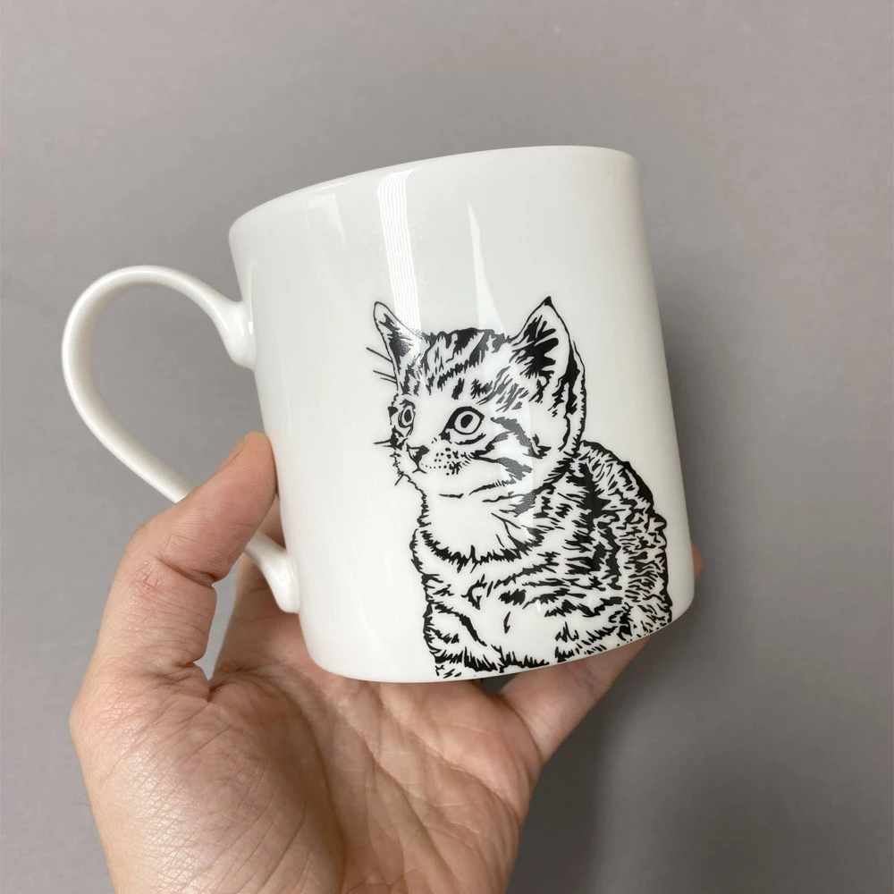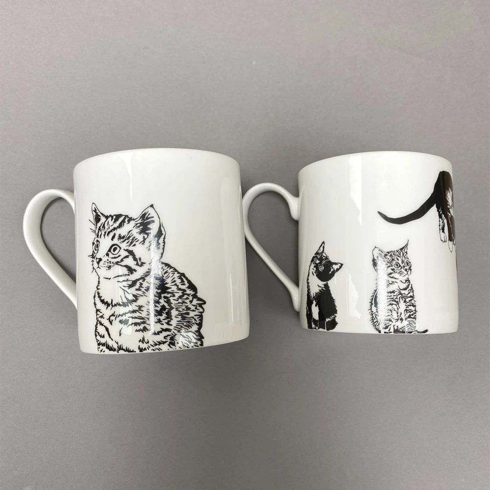 This Cuddle Time mug from Penguin Ink has been screen printed and handed decorated in Stoke on Trent. The mug has the cuddly kittens on the front and Maud the tabby on the reverse, in addition to a Molly the kitten peering into the inside of the mug.