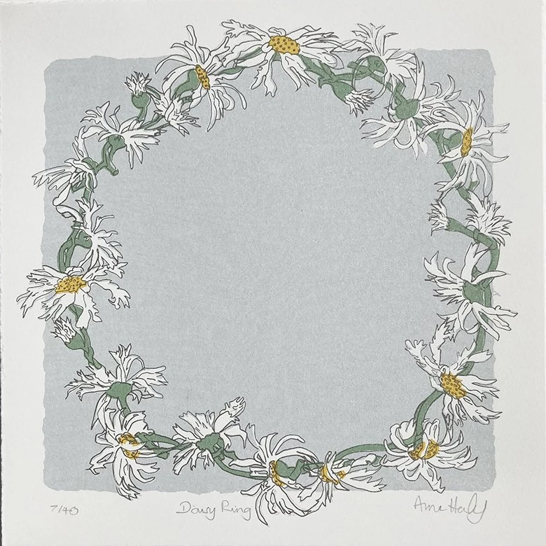 The Daisy Chain screenprint is a four colour print on Somerset paper by Anna Harley. Anna uses a combination of drawing, digital photography and objects directly exposed on the screen to create the individual layers in her prints. She enjoys the tension these different sources create in her finished work.