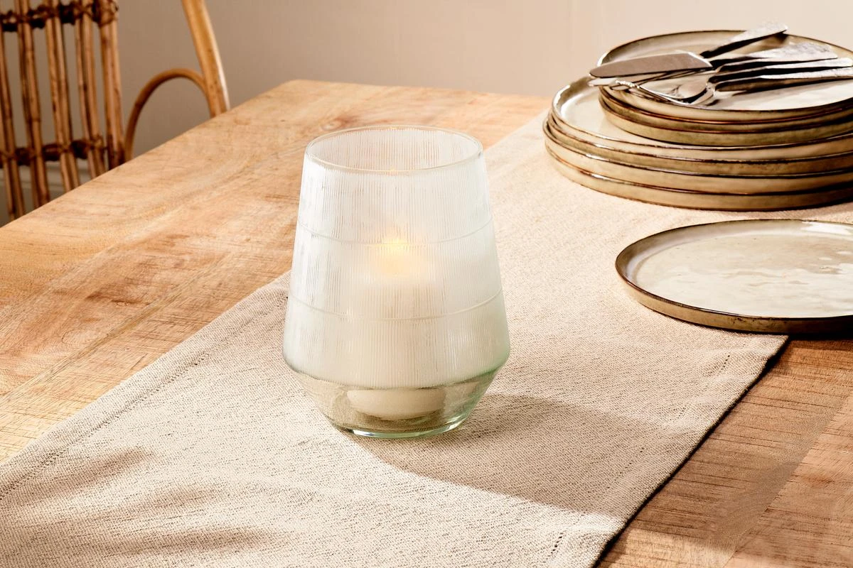 These hand crafted Dera Tealight holders from Nkuku are made from recycled glass and etched by hand to create the lovely decoration. The light reflects beautifully from tealights to create ambience and a warm glow that sets any table to advantage. Mix and match the sizes.