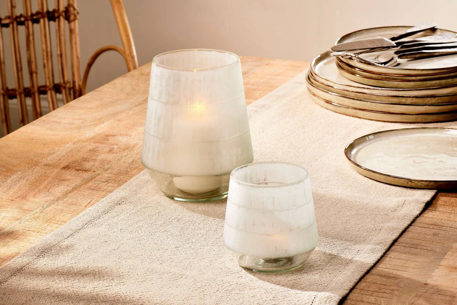 These hand crafted Dera Tealight holders from Nkuku are made from recycled glass and etched by hand to create the lovely decoration. The light reflects beautifully from tealights to create ambience and a warm glow that sets any table to advantage. Mix and match the sizes.