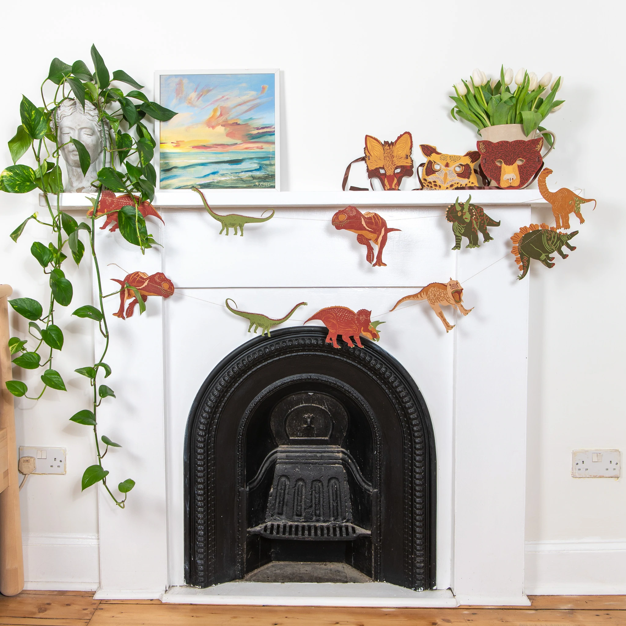 Hand printed three metre long dinosaur paper garland, featuring ten screen printed dinosaurs. The garland is printed on both sides on thick, hand made cotton paper. The shapes are sewn in a random order along strong cotton thread, with hanging loops either end, meaning you can hang your garland straight away.