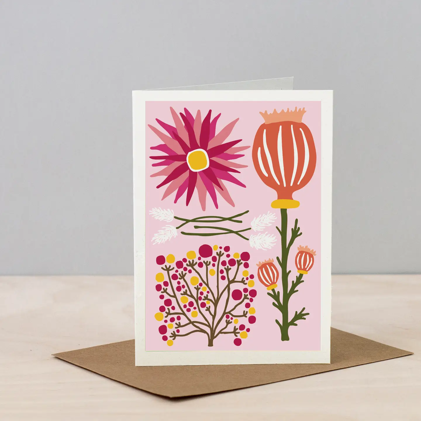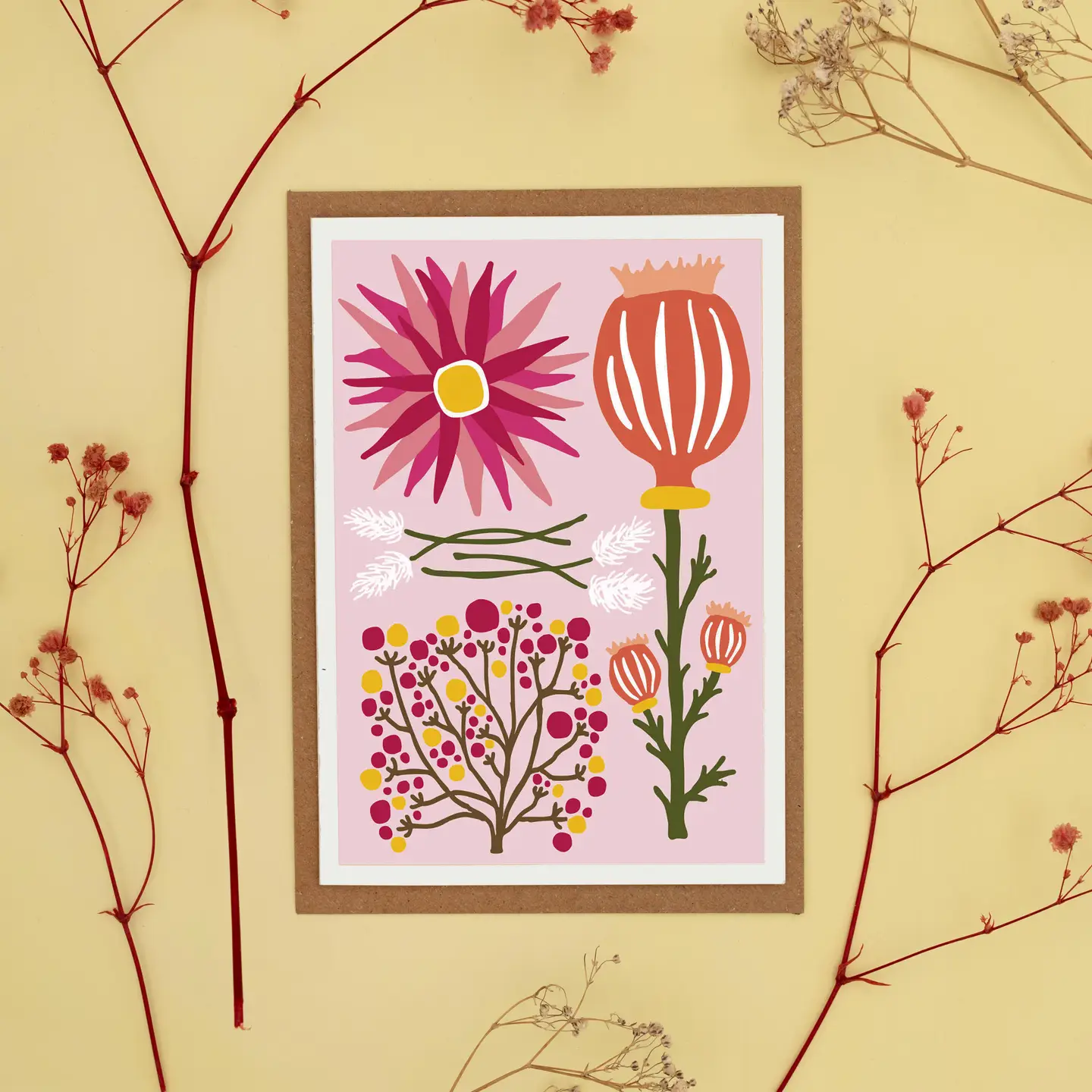 This lovely Dried Flowers Greeting Card has been printed on a tactile, thick board in soft white. It is A6 and printed on 300gsm FSC board in soft white and comes with a recycled kraft envelope. It has been digitally printed and die cut.