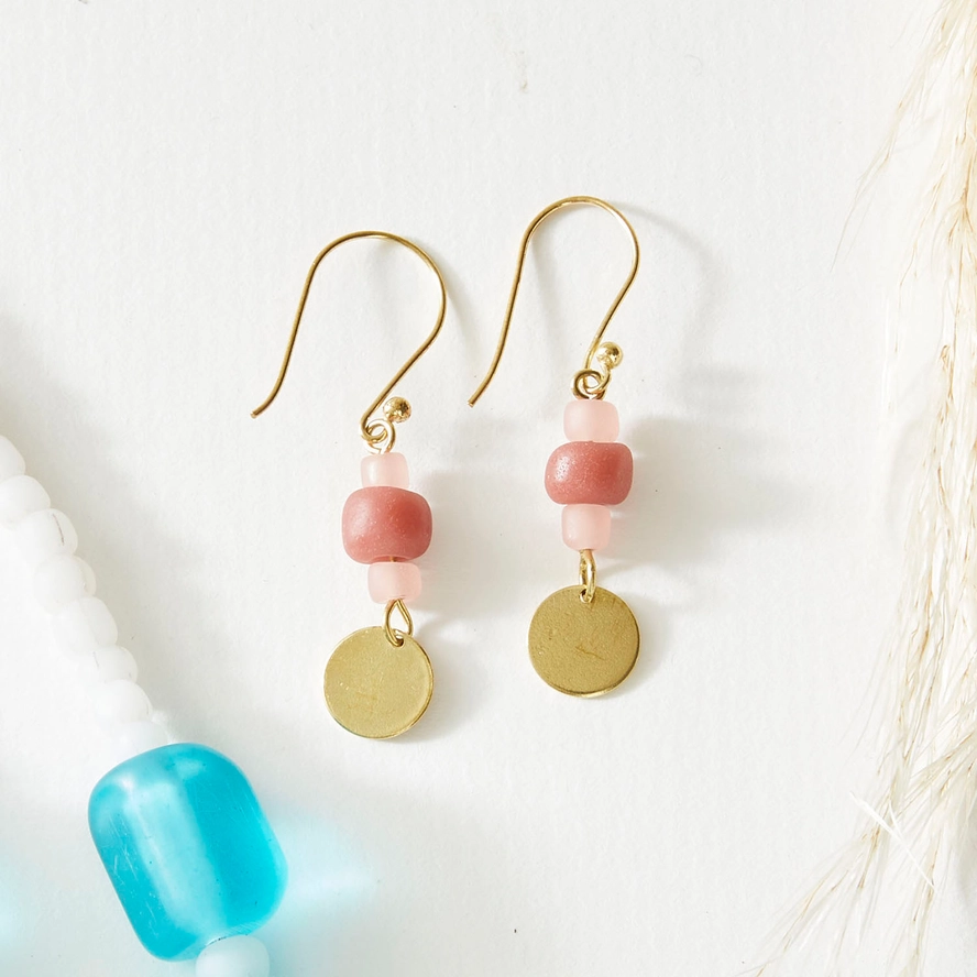 These Earth Trio Earrings in pink from Just Trade have been handmade from recycled glass beads. They have been crafted by skilled makers in East Java, Indonesia, who are paid a fair wage for their work. Each bead is unique, created using distinctive processes that have been developed over many years.