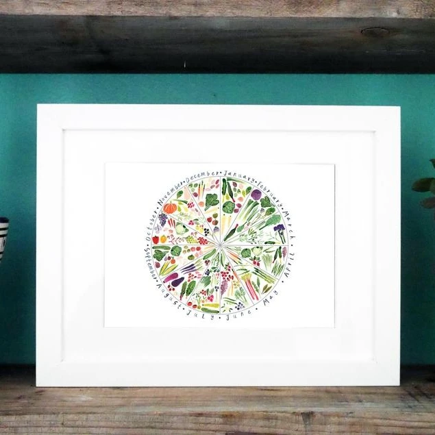 This is a wonderful limited edition Eat Fresh giclee print by Hattie Buckwell. Hattie is an artist working in Bristol, England. She primarily works in watercolour. This print is taken from her original artwork and shows what is in season throughout the year.