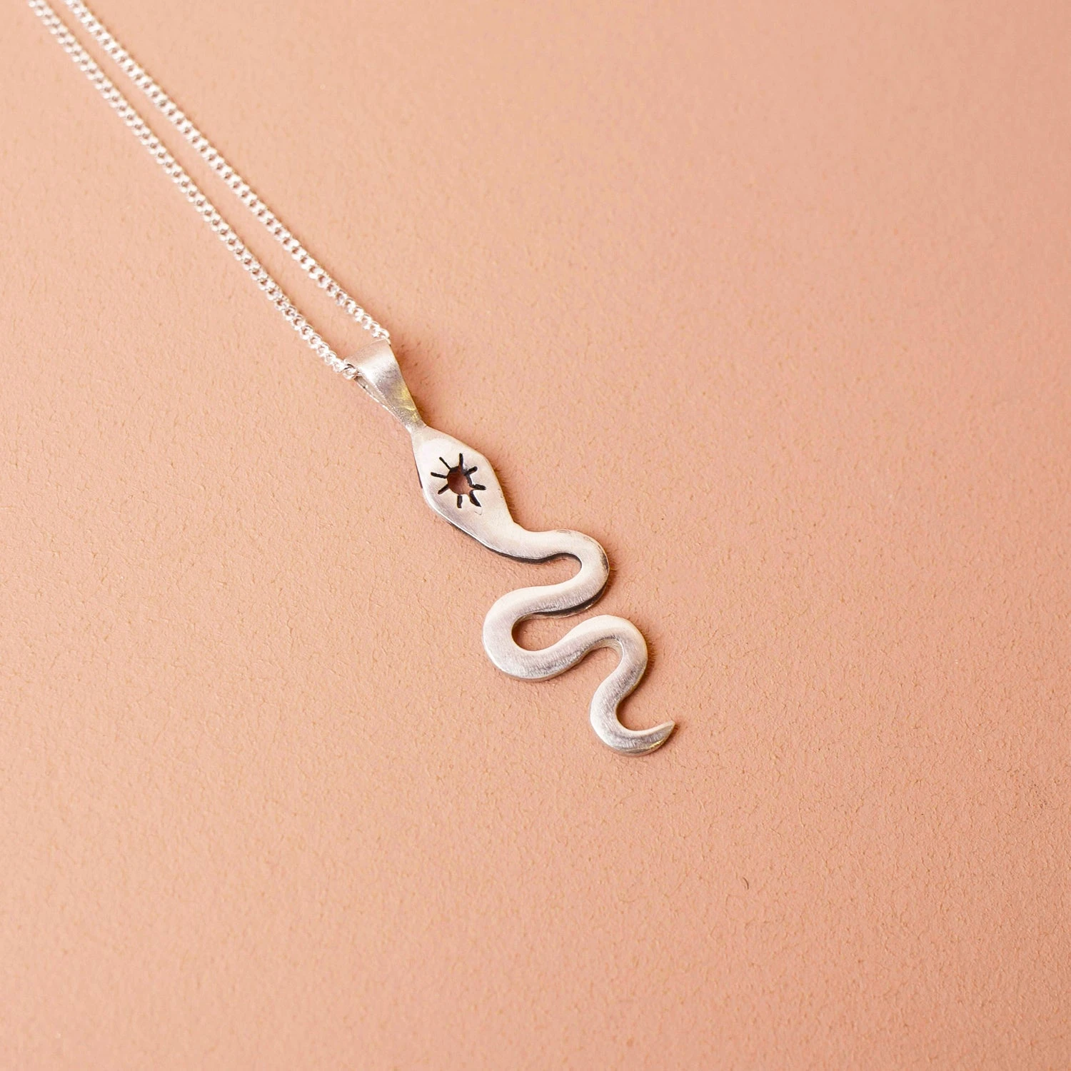 Serpent pendant necklace from Lima Lima with cut out start burst detail. The pendant sits on an 18 inch fine curb chain.