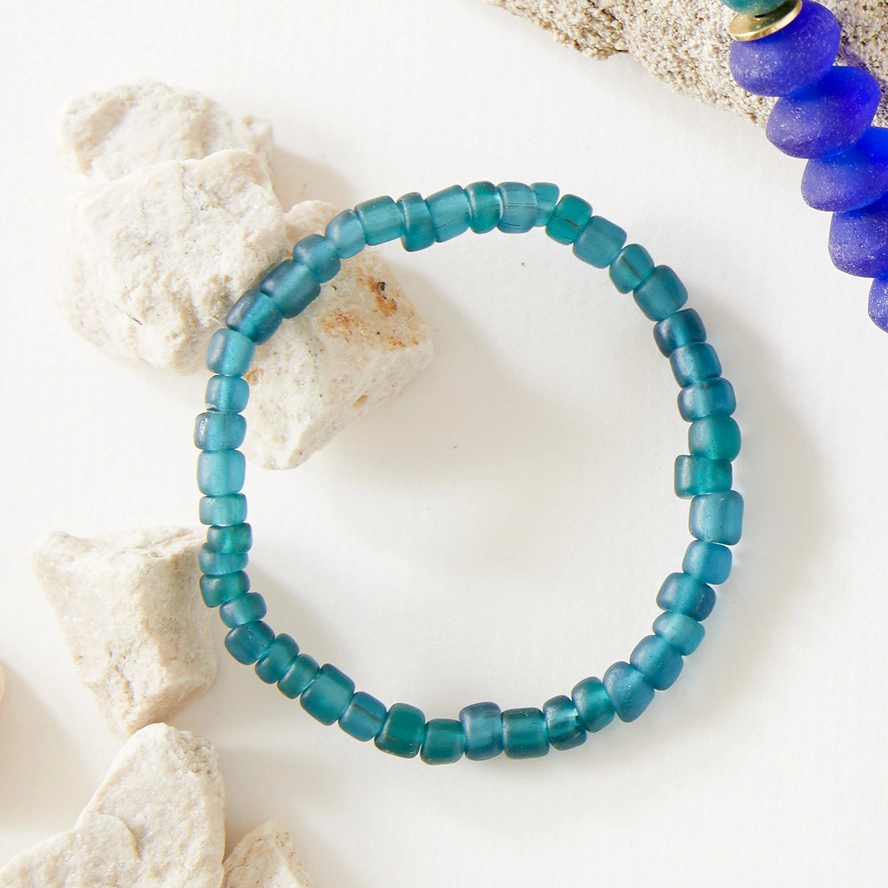 From Just Trade, this Egyptian Teal Beaded Bracelet is handmade. The beads are skilfully created by melting down pieces of waste glass and formed by hand using specialist tools. The recycled beads are combined with handcrafted brass components. They have been crafted by skilled makers in East Java, Indonesia, who are paid a fair wage for their work. Each bead is unique, created using distinctive processes that have been developed over many years.