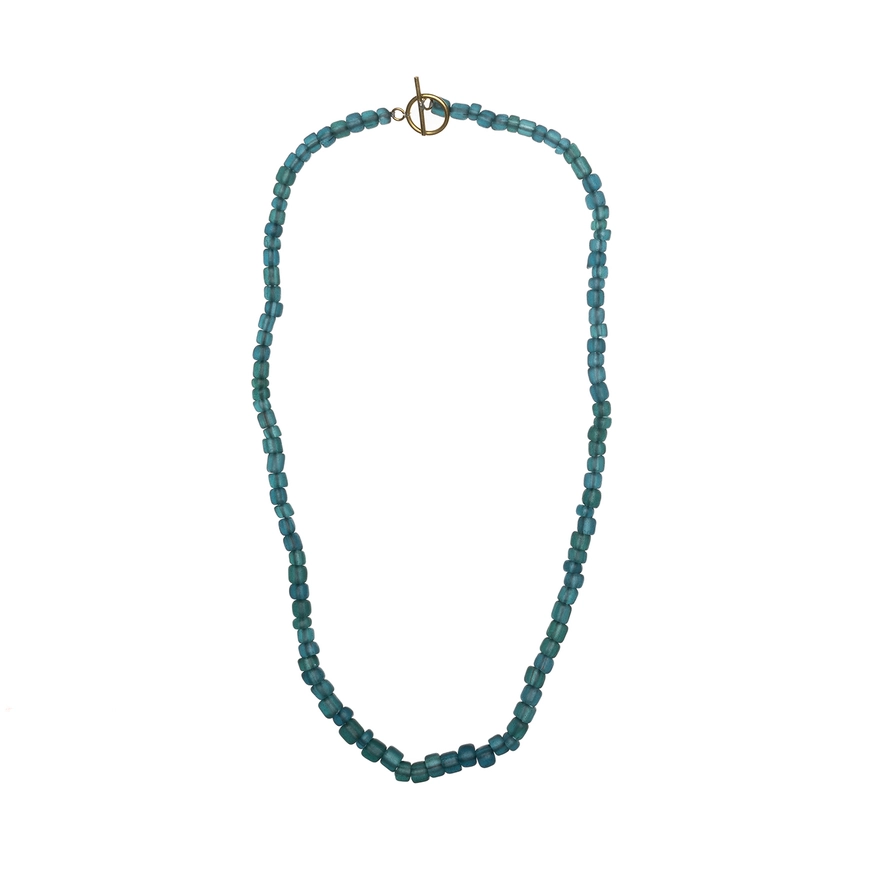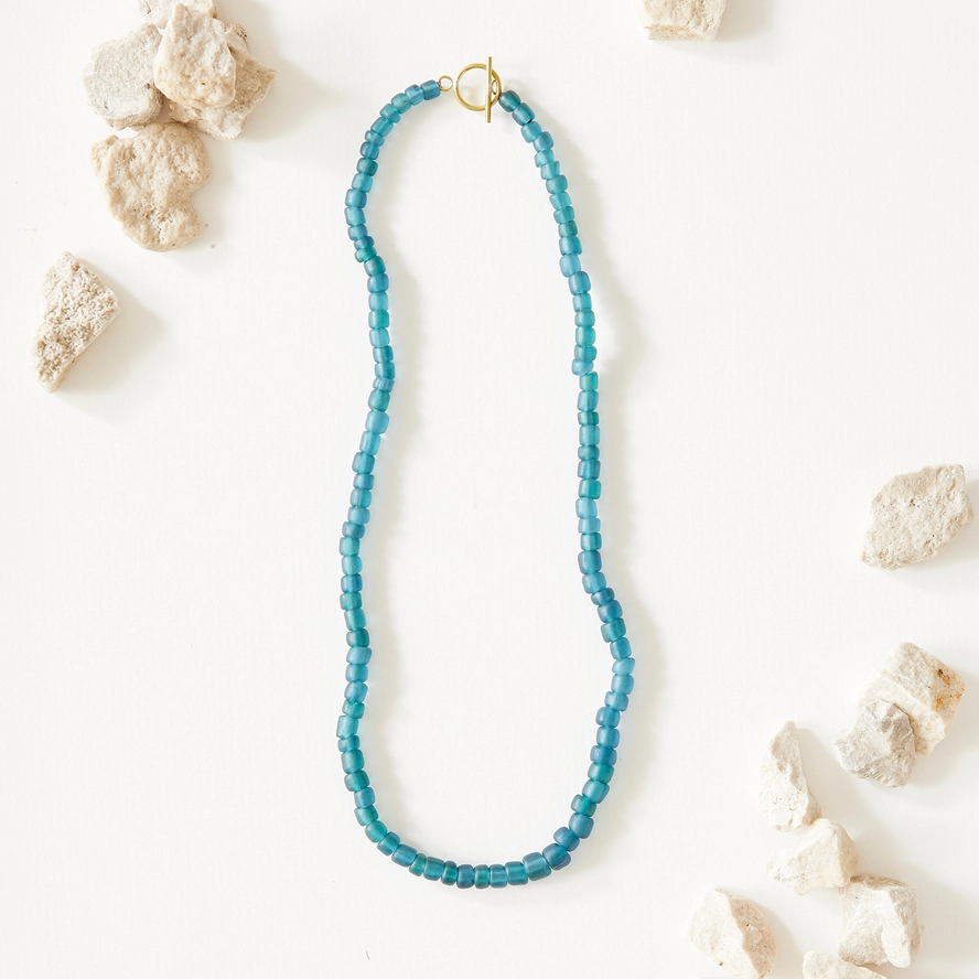 From Just Trade, this Egyptian Teal Beaded Necklace is handmade. The beads are skilfully created by melting down pieces of waste glass and formed by hand using specialist tools. The recycled beads are combined with handcrafted brass components. They have been crafted by skilled makers in East Java, Indonesia, who are paid a fair wage for their work. Each bead is unique, created using distinctive processes that have been developed over many years.