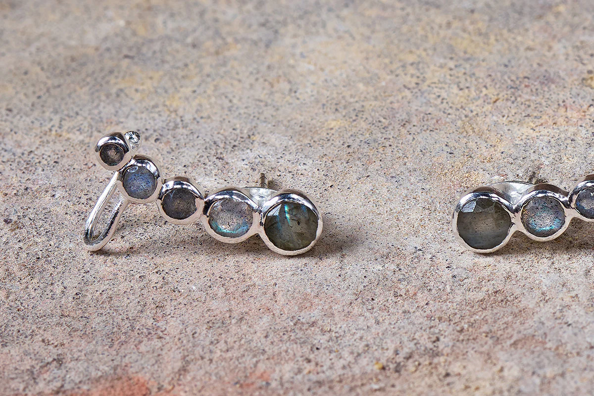 These new Elina labradorite Ear Climber earrings from Nkuku are delicately shaped and hand set with five semi-precious stones that are graduated in size to accentuate the curve of the design.