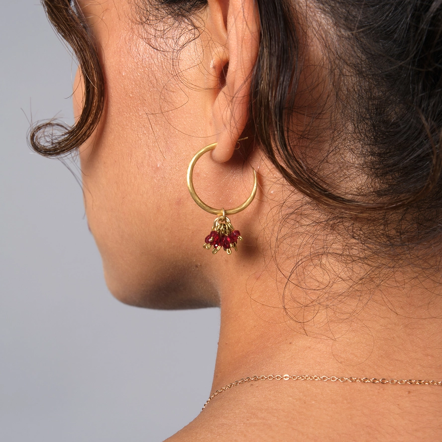These gold plated Elizabeth hoops from Just Trade have been decorated with individual glass crystal beads that are skilfully combined together to create shimmering clusters, perfect for dressing up any outfit. Handmade by the women from the Flowering Desert in India.