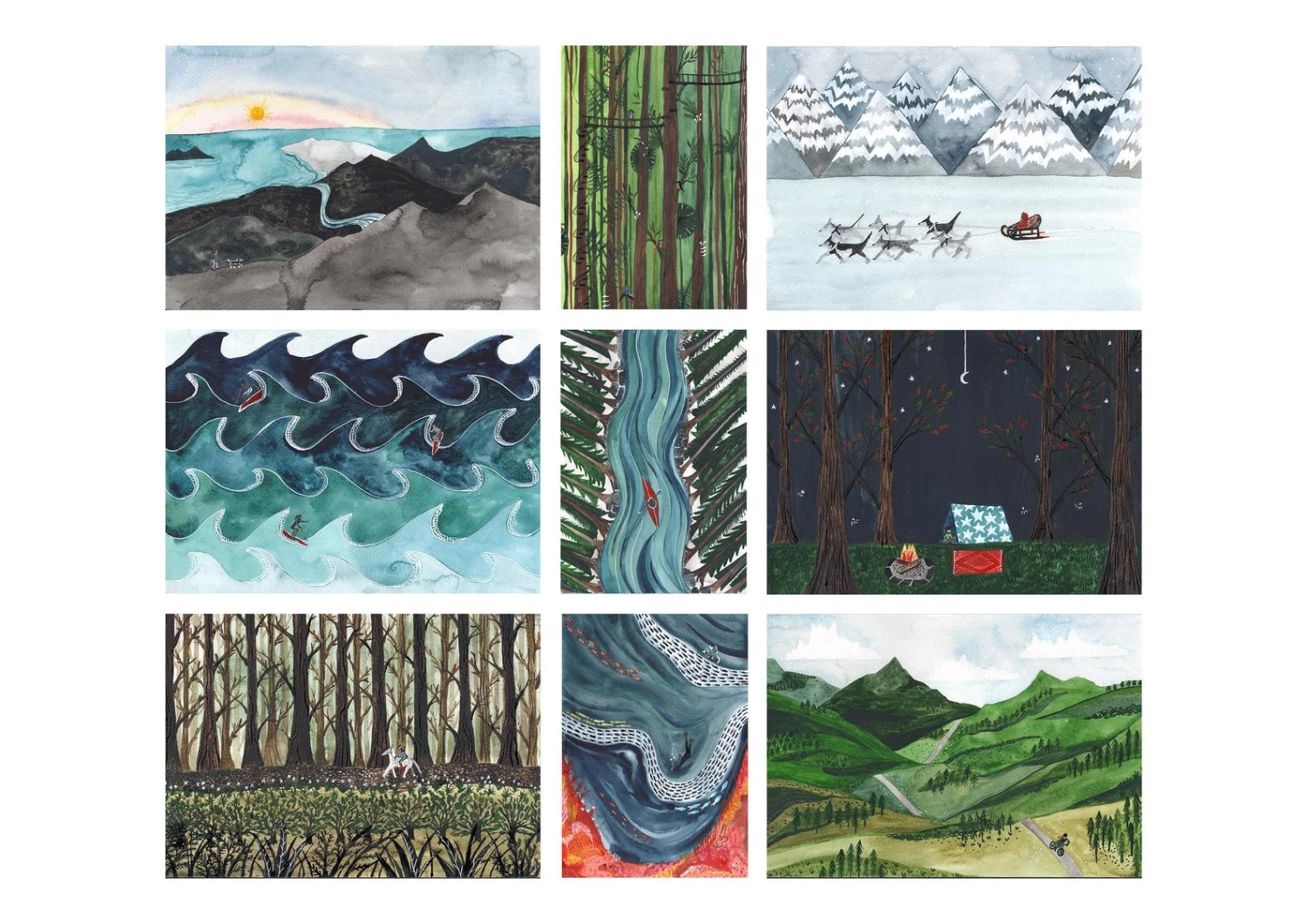 This is a wonderful limited edition Wanderlust Adventure giclee print by Hattie Buckwell. Hattie is an artist working in Bristol, England. She primarily works in watercolour. This vibrant happy print features prints of 9 original watercolours by Hattie.
