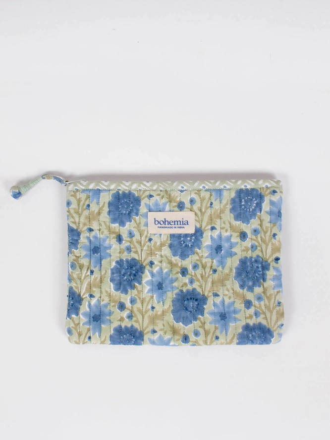 These Floribunda Cosmetic bags are 100% quilted cotton zip purse hand block printed in Jaipur, fully lined with a colour matching ditsy print and finished with a handcrafted zip pull.