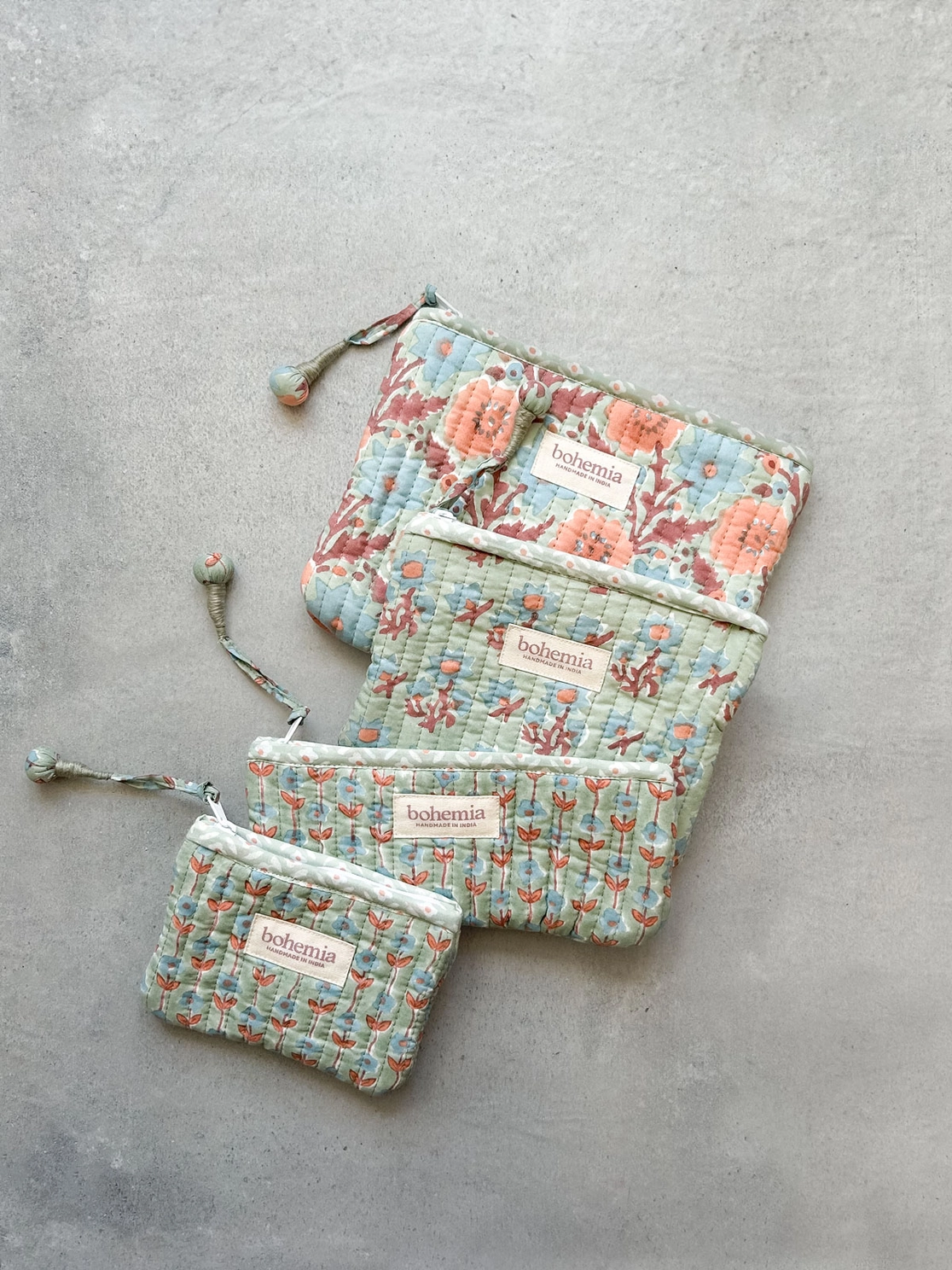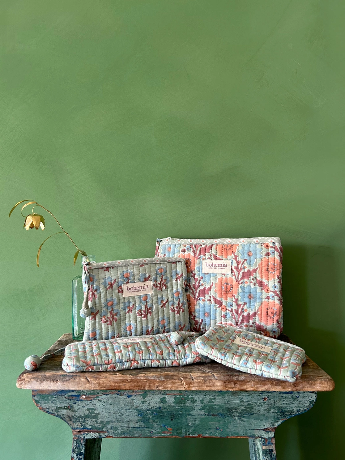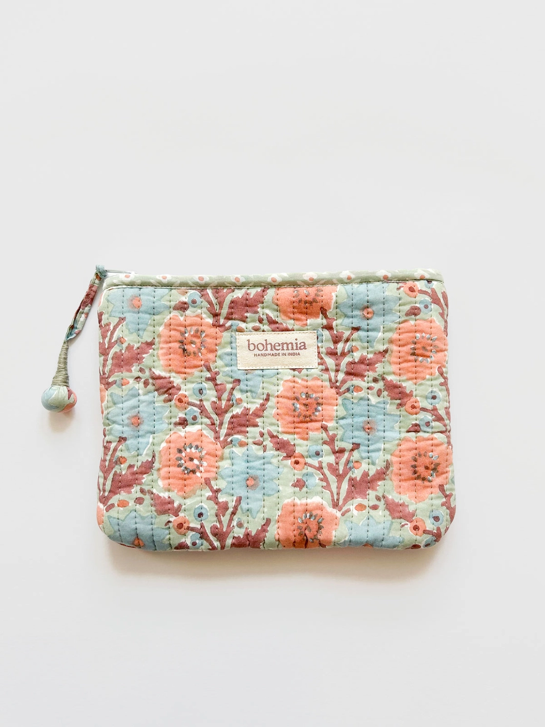 These Floribunda Cosmetic bags are 100% quilted cotton zip purse hand block printed in Jaipur, fully lined with a colour matching ditsy print and finished with a handcrafted zip pull.
