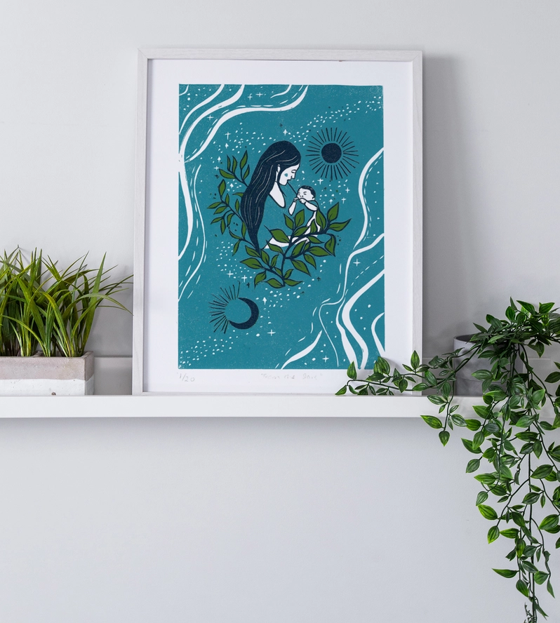 A 3 colour linoprint made using the reduction process. A celebration of motherhood, new life and the humbling miracle of birth.