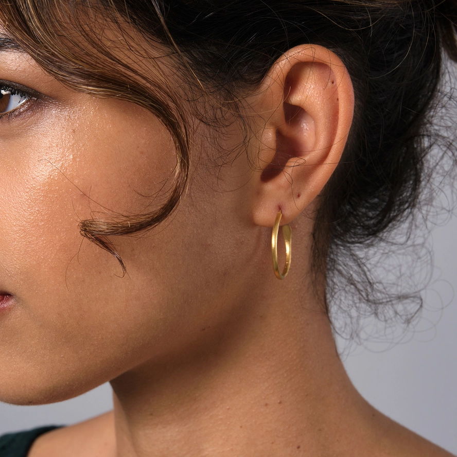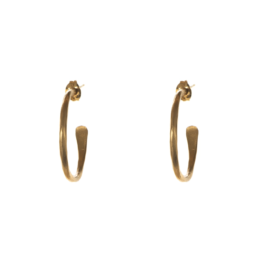 These small gold hoops from Just trade are made from strips of brass rod skilfully hammered to create the subtle light-catching texture and round form of each piece. The collection is finished with a layer of plating in either sterling silver or 22ct gold.