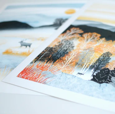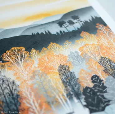 Inspired by the incredible changing autumn colours of the aspen and birch forests of the Cairngorms and Scottish Highlands. This print forms part of Ruth Thorp’s Golden Forest Collection.