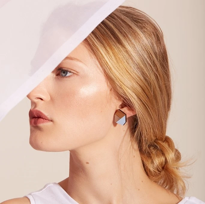 These beautiful handmade Gwen steel earrings from A New Form have been carefully etched from walnut wood inlaid with Brushed Steel and Peaceful Blue formica. Each on has then been varnished to ensure that the surface will last for a long time in perfect condition. The backs are silver plated. All A New Form jewellery is handmade in their Wales studio. Due to the natural wood, pieces will vary in colour and grain making each unique.
