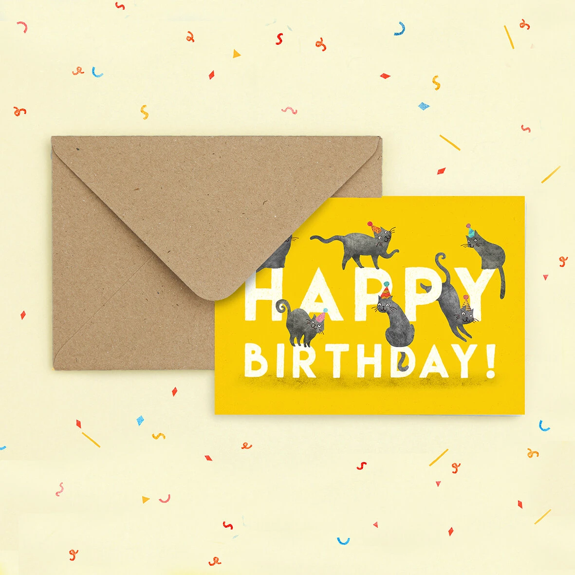 These beautiful Cat Birthday Cards are all designed by artist Emily Nash in her Bristol studio and printed in the UK. All cards are A6 in size and all paper used is recycled or FSC approved paper stock. The envelopes are made from 100% recycled material and in a bid to cut down on single use plastic greeting cards come with card clasp stickers.