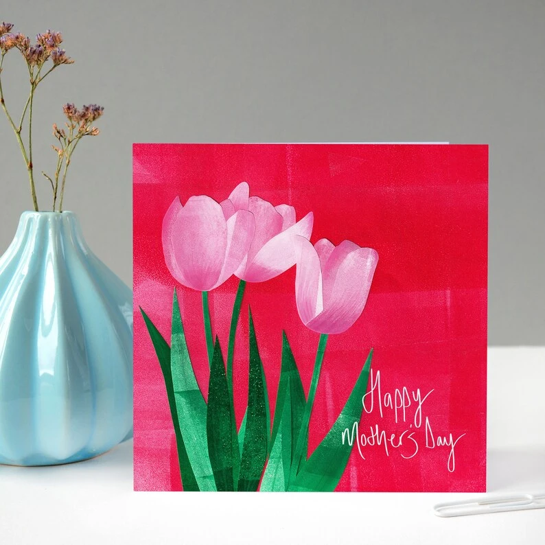 Happy Mother’s Day Pink Tulips Card illustrated by Fiona Clabon. A beautiful Mother’s Day Card with a bold contemporary design, created by hand using paper collage, with a delicious textured pink background. This design features handwritten text saying Happy Mother’s Day.