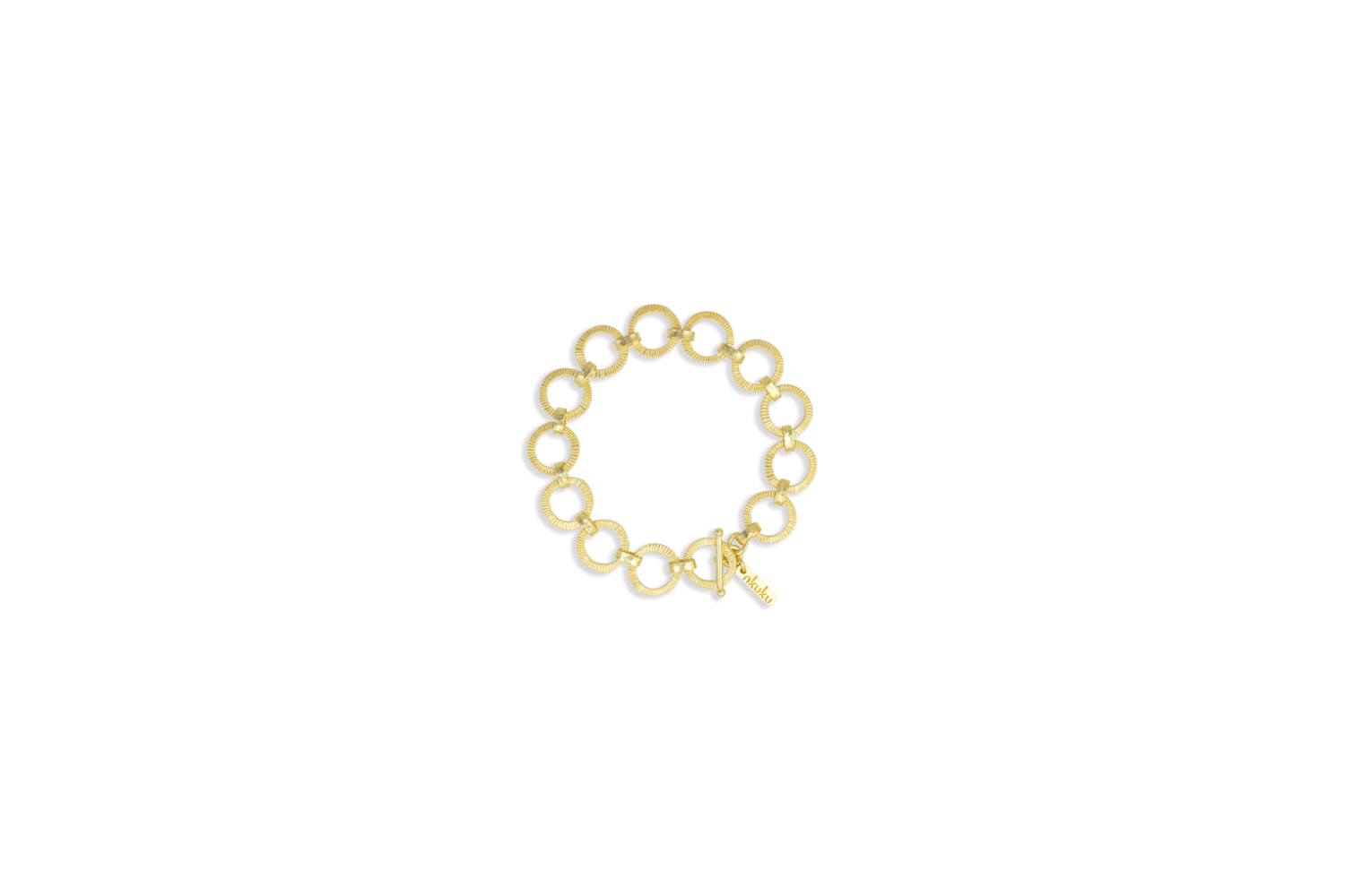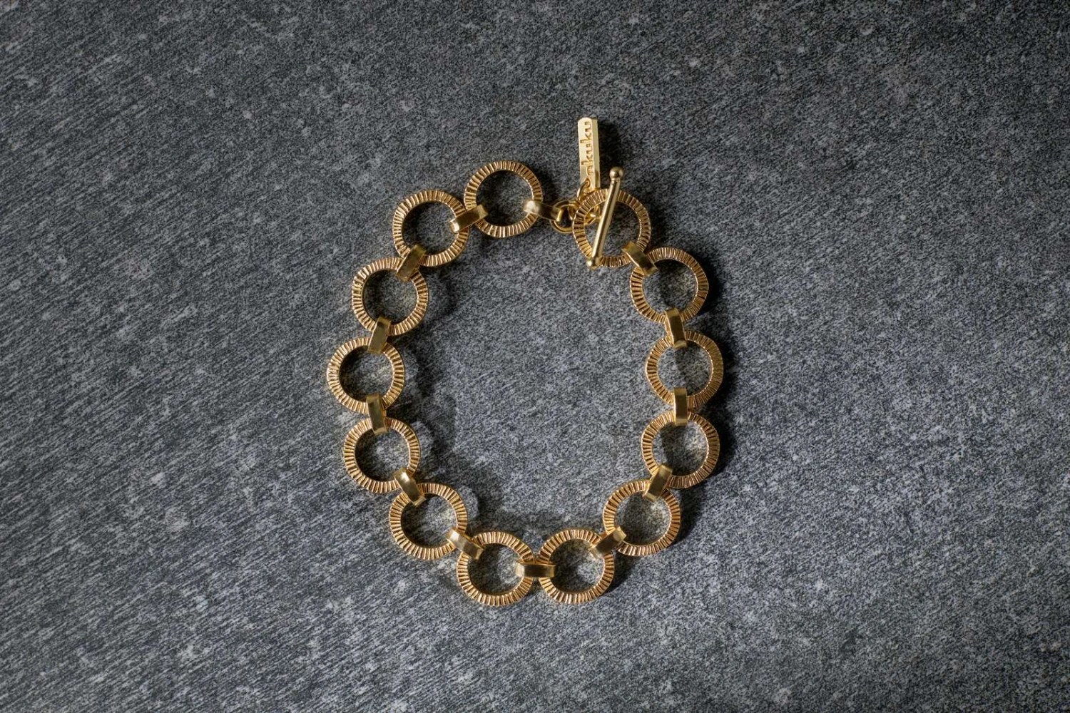This beautiful Hara Bracelet from Nkuku has been handmade by artisans in Rajasthan. All Nkuku jewellery is handmade for them by a fair trade enterprise. It is made from hand etched warm gold links from brass plated in 22 karate gold. A lovely statement piece that has been designed to pair with the Hara Onyx Necklace simple but stylish design.