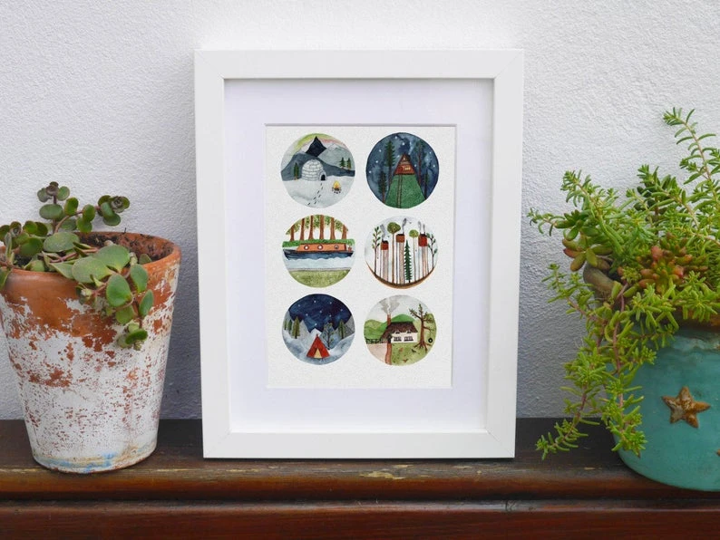 This is a wonderful limited edition Homes of the World giclee print by Hattie Buckwell. Hattie is an artist working in Bristol, England. She primarily works in watercolour. This vibrant happy print is called ‘Homes of the World’ and features prints of 6 original watercolours by Hattie. Each depicts a different kind of home, from an igloo to a canal boat. It encapsulates a sense of adventure and the importance of a cosy home wherever you live.