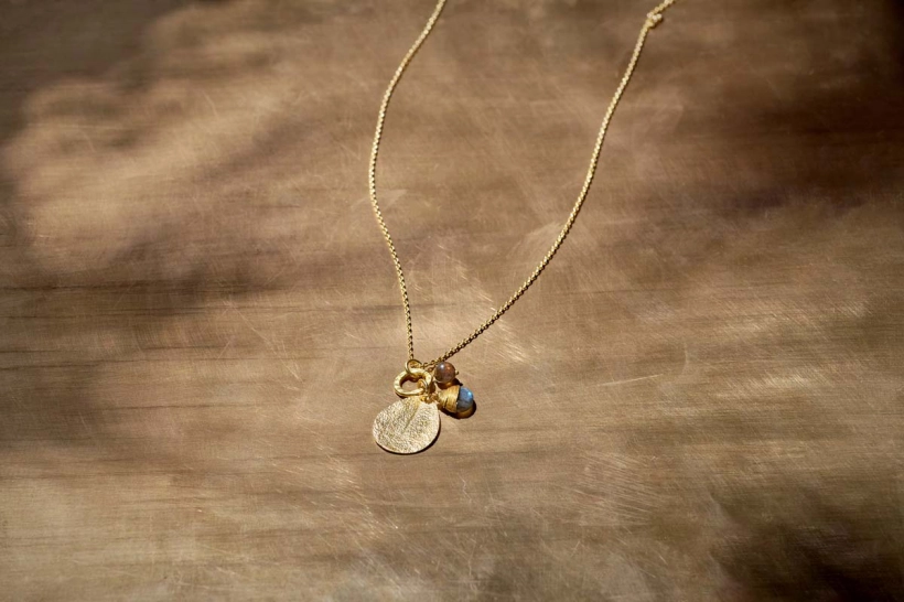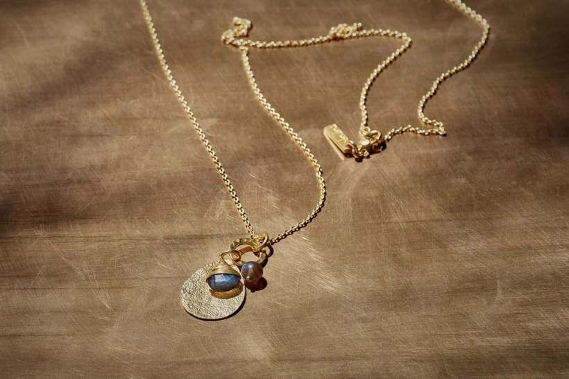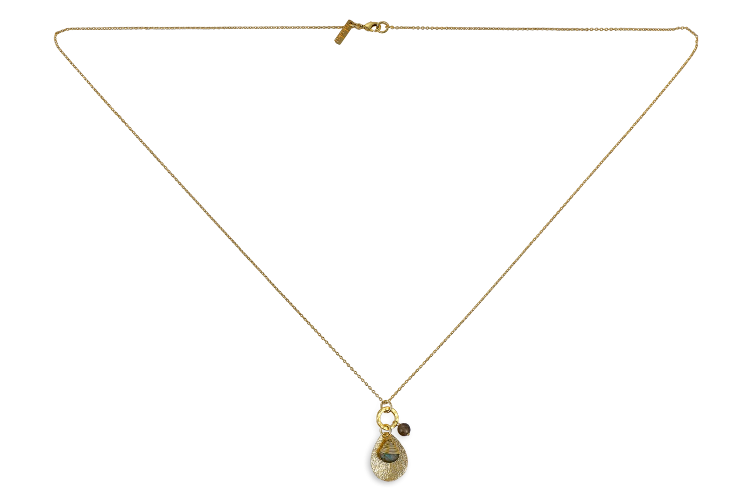 This beautiful and elegant Idalia necklace has three unique pendant pieces that lie at the base of the chain. The pendants include a gold disc in the shape of a tear drop, crafted from gold and finished with a textured hammered effect. A small Labradorite stone rests neatly on the disc, where the natural stone is encased in layers of thin gold to keep it in place and a small Labradorite bead rests neatly alongside.