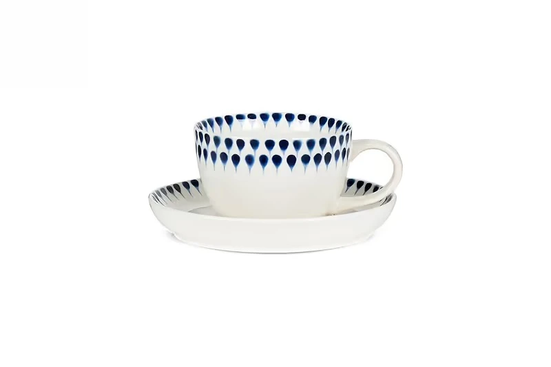 These beautiful indigo drop pattern cups and saucers are from Nkuku. They have been handmade by craftsmen in Vietnam using age old techniques. They form part of a dinnerware collection including cereal bowls, dinner plates and serving dishes. Each piece is hand painted. These cups are a cream colour with an indigo blue pattern.