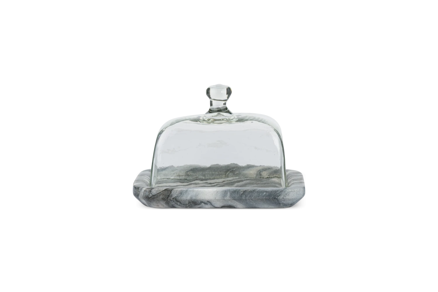 New from Nkuku this tactile Kallso Butter Dish is the perfect table accessory. Ideally suited to storing butter the cool marble and glass cover will become an essential part of your breakfast ritual. Made with recycled handblown glass and grey variegated marble.