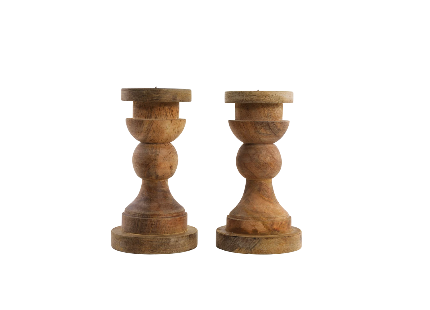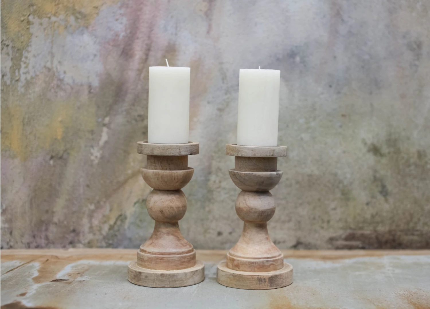 These chunky Kibibi mango wood candlesticks are from Nkuku. They are substantial enough to decorate a mantlepiece or form part of a display of different sized candlesticks. Made by hand in India. The natural tones of the wood and curves add real character to these candlesticks.