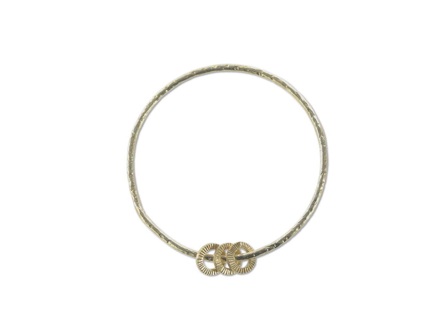 This beautiful Lalia gold bangle from Nkuku has been handmade by artisans in Rajasthan. All Nkuku jewellery is handmade for them by a fair trade enterprise. It is made from brass plated in 22 karat gold. The lovely hoop shapes have been hammered to create a textured surface to the decoration. A simple but stylish design.