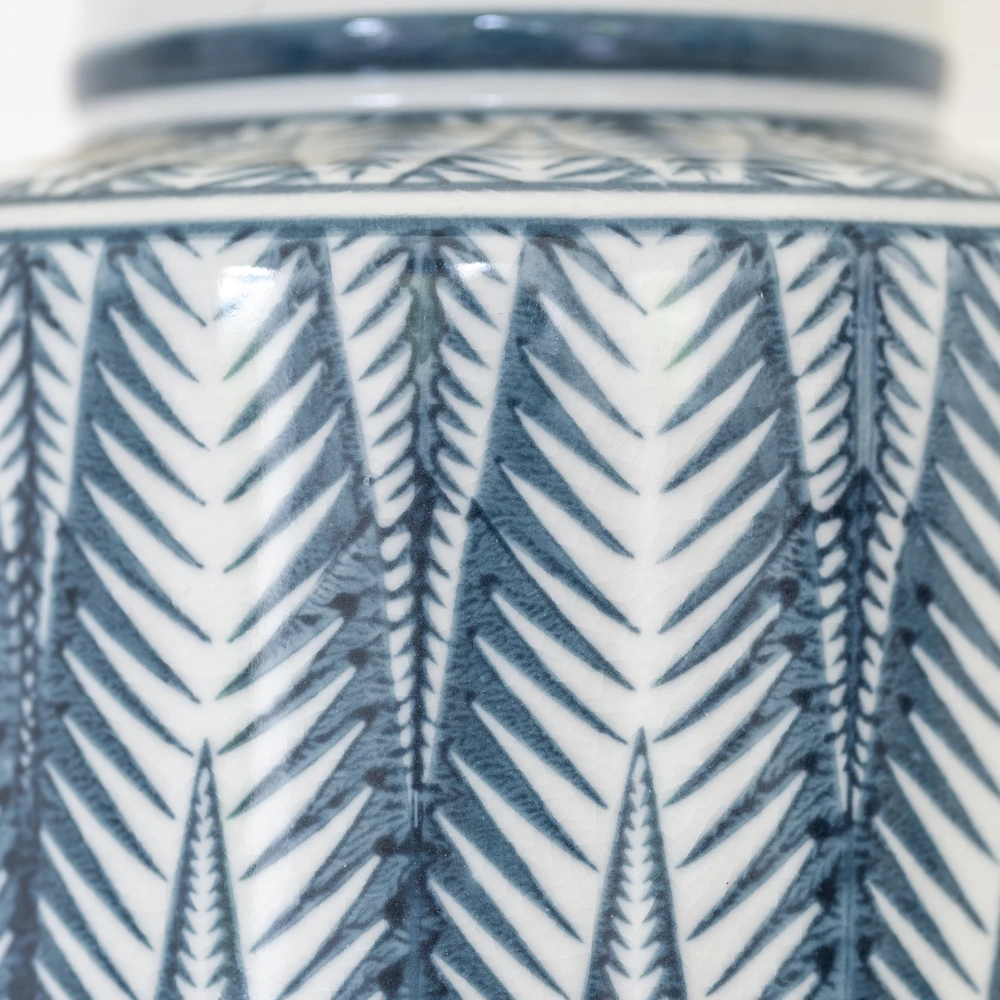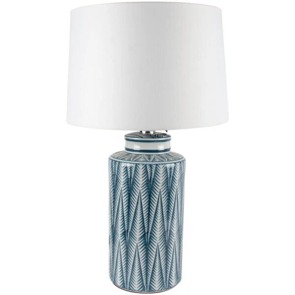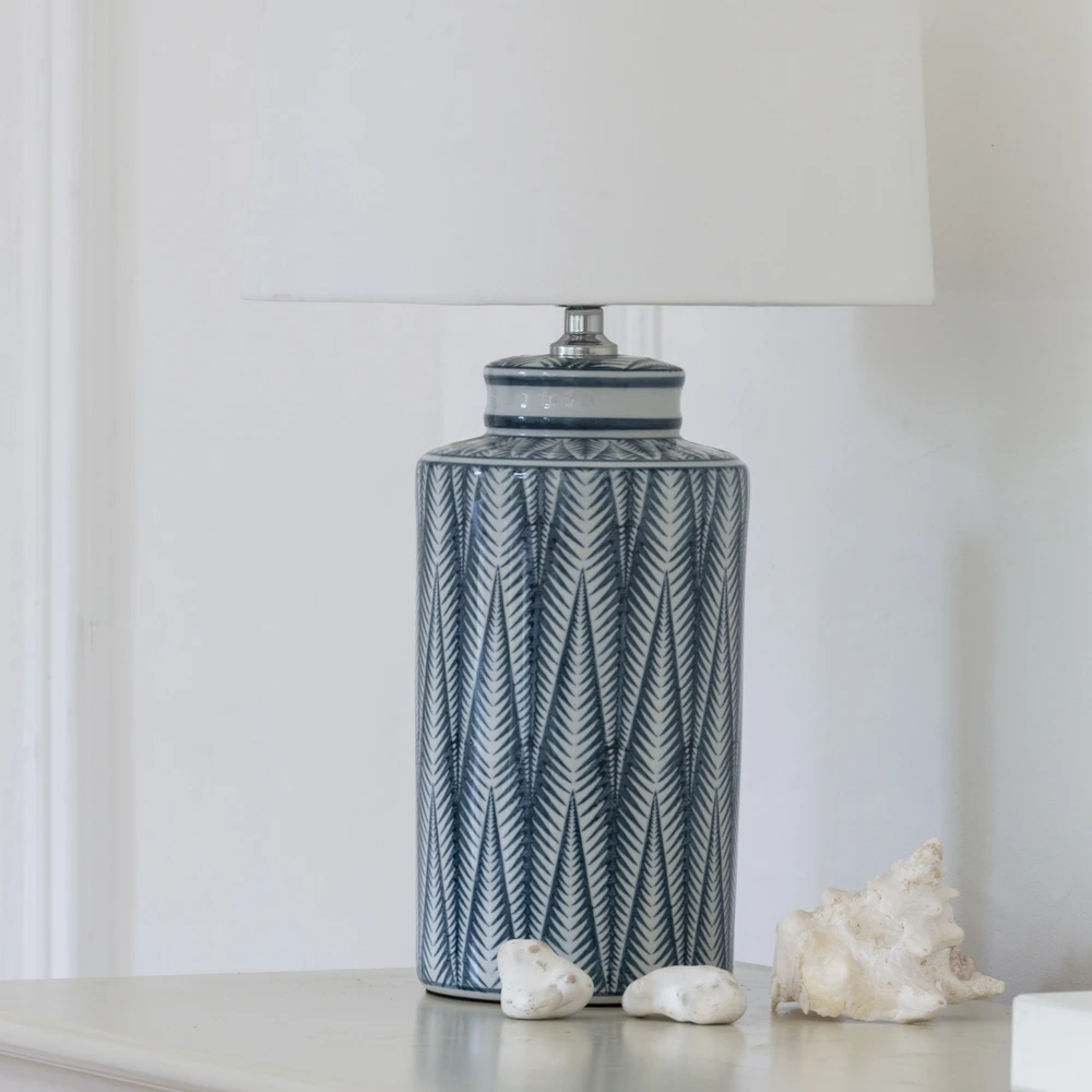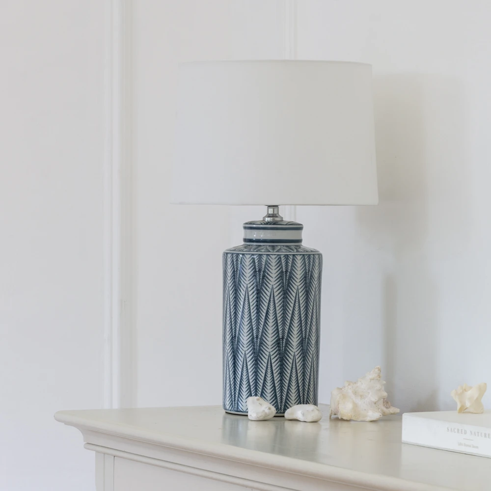 This charming Jammu Lamp from Grand Illusions will add colour and interest to any living space. The block pattern design on the ceramic base is in a teal blue that sits beautifully with its accompanying simple white shade.