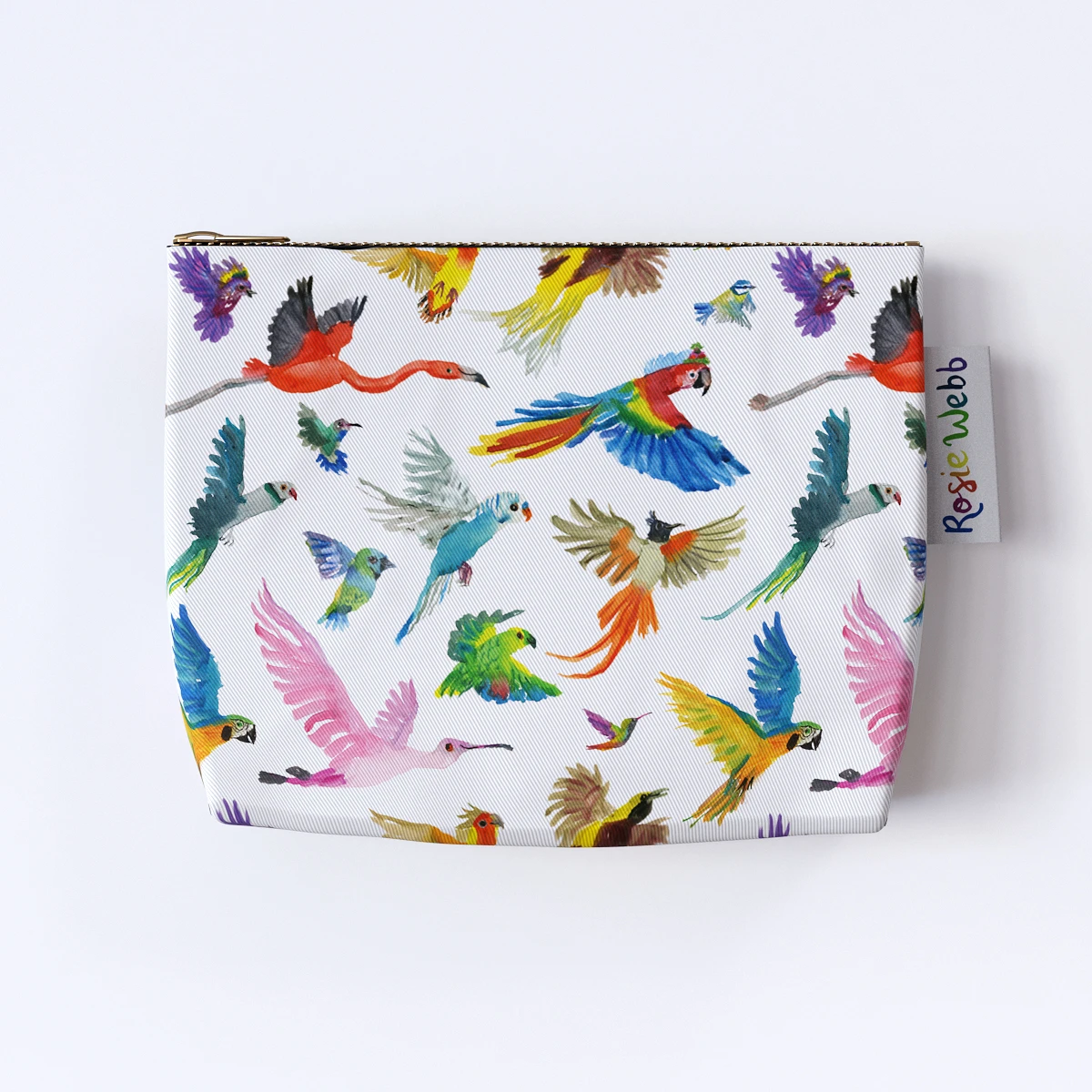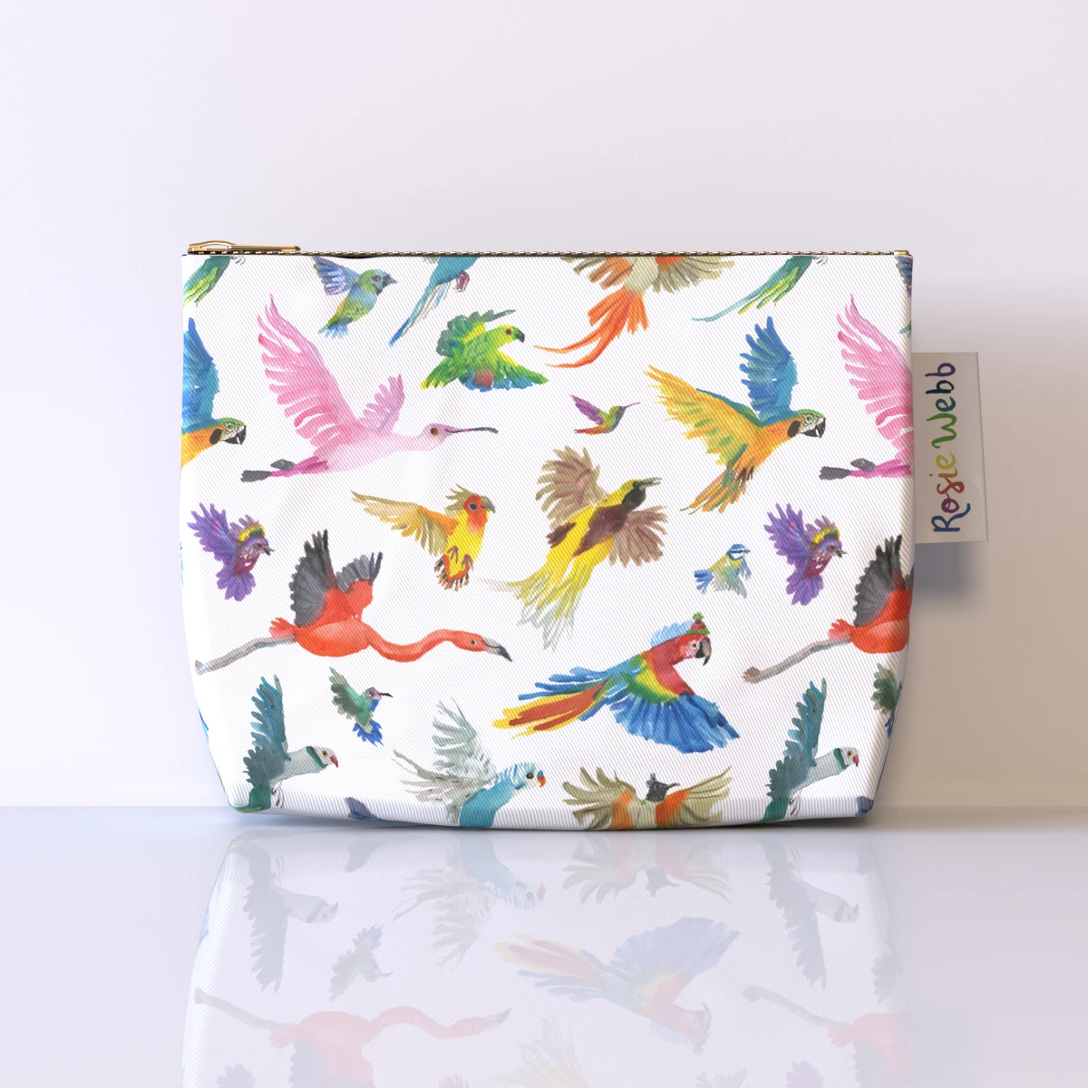 Cotton drill birds wash bag / make up bag from artist Rosie Webb. It is lined with waterproof fabric and comes with a hard-wearing brass zip. We love Rosie’s animals in boots – see her watercolour prints in our Art section too!