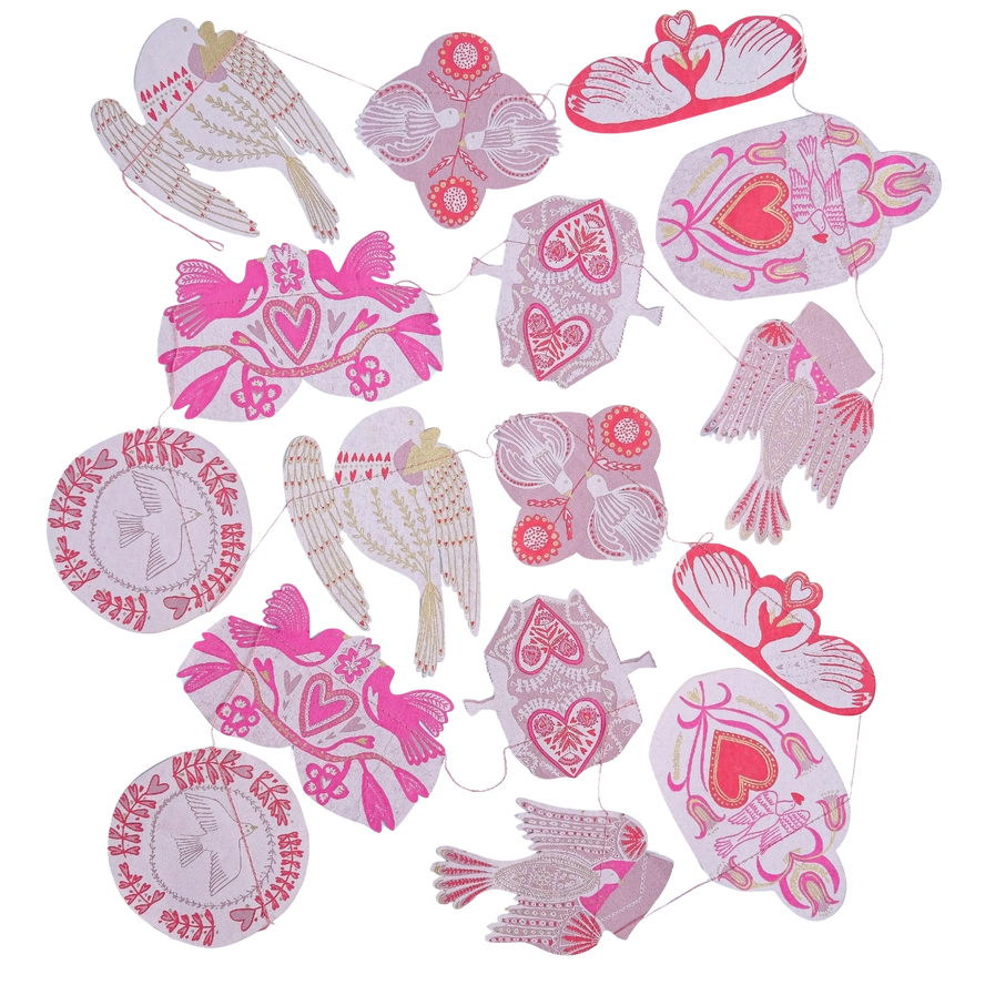 Hand printed three metre long paper Love Birds paper garland, featuring ten screen printed Love Birds. The garland is printed on both sides on thick, hand made cotton paper. The shapes are sewn in a random order along strong cotton thread, with hanging loops either end, meaning you can hang your garland straight away.