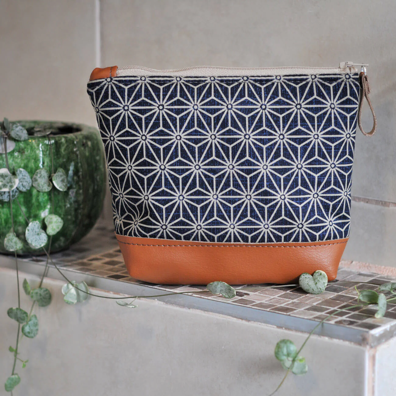 This make up bag is designed and handmade by Lauren Holloway. Ethically made using sustainable recycled leather and beautiful patterned fabric whose design has been inspired by Japan. This is a practical compact make up bag or washbag for weekends away. It also features a wipeable lining perfect for dealing with any accidental spills.