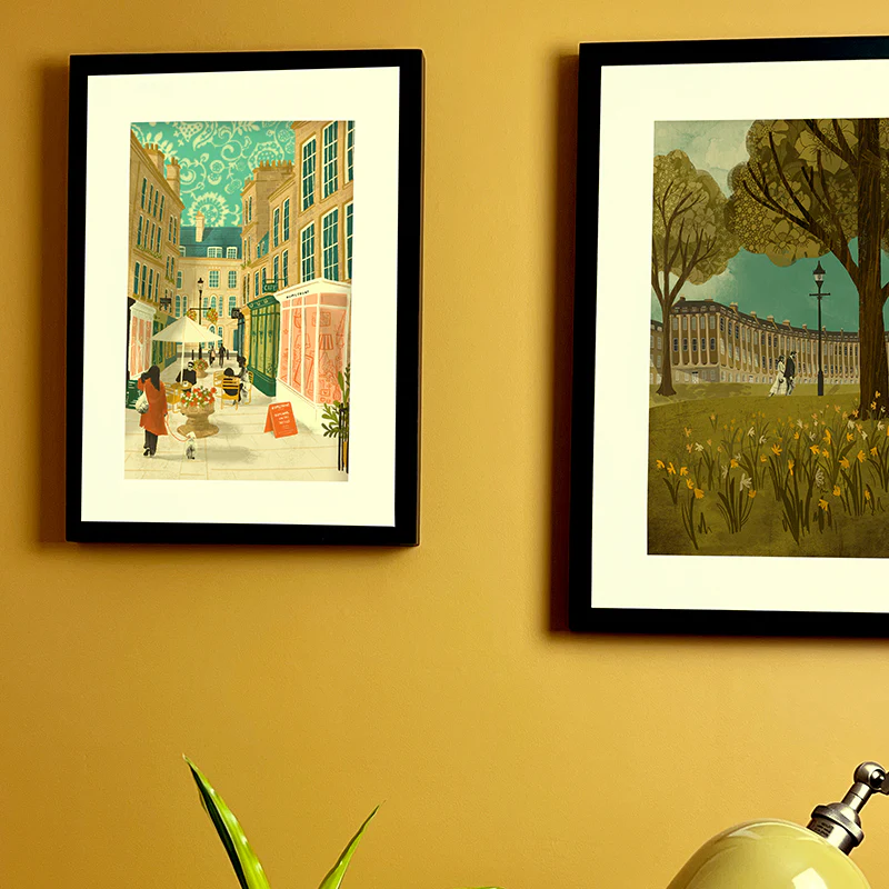 This lovely Margaret’s Buildings Bath Art Print shows an iconic spot in Bath. It is part of a series of Illustrations inspired by the gorgeous city of Bath during springtime. This beautiful pedestrianised street is also home to our shop and we feature prominently in this beautiful print.