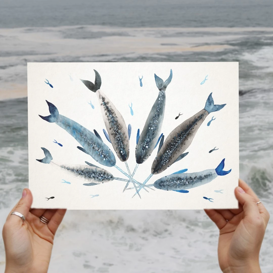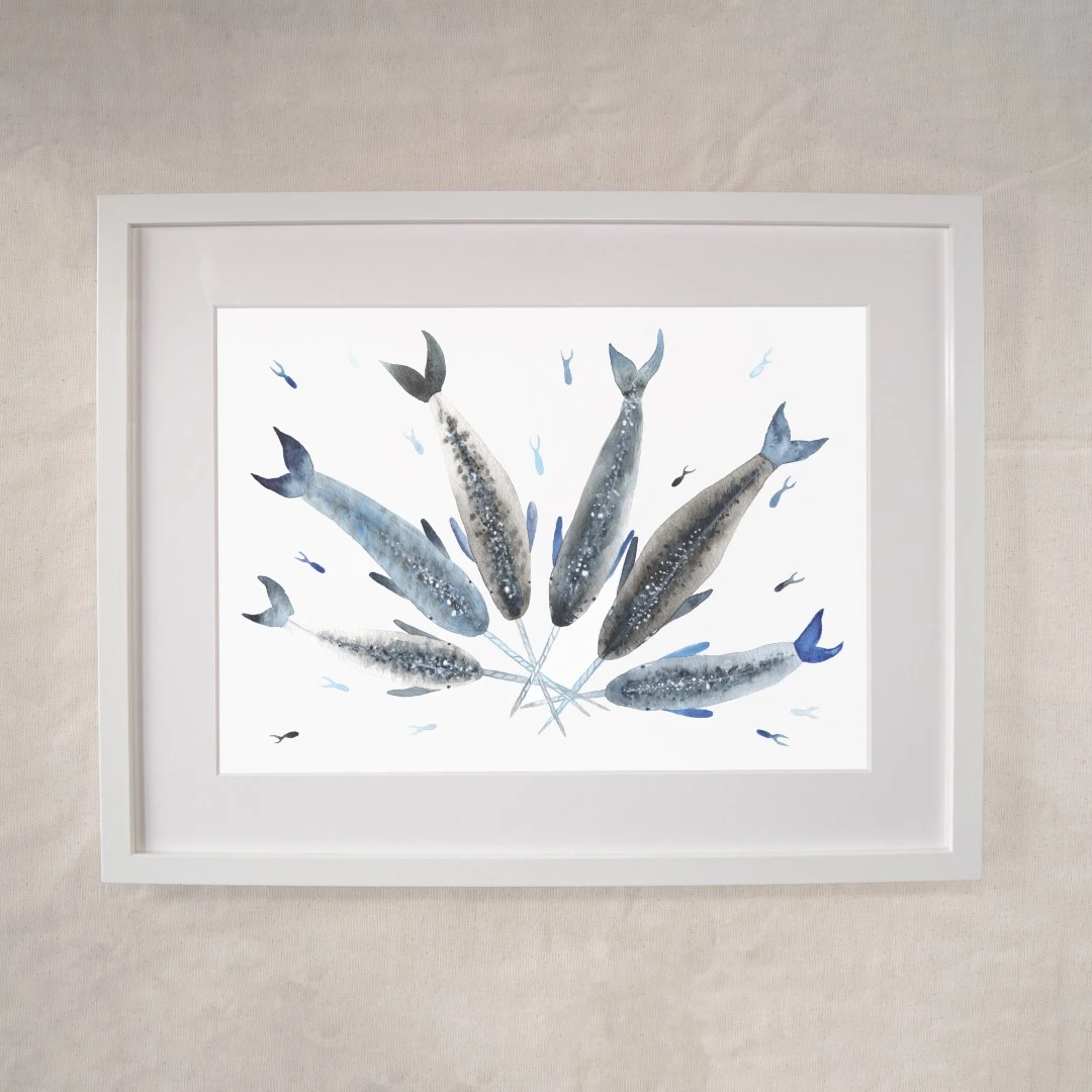A limited edition giclée print from an original watercolour painting ‘Narwhal Pick up Sticks’.