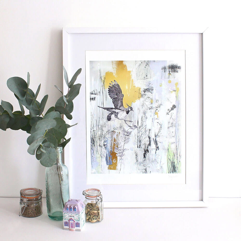 This giclée print by Sky Siouki features an original hand-drawn illustration of a northern lapwing digitally printed onto high quality 310gsm etching rag. The sprightly wading bird hops down into an Autumnal landscape of beautiful ochre and lilac hues settling among the leafy sprigs on a textural collaged background.