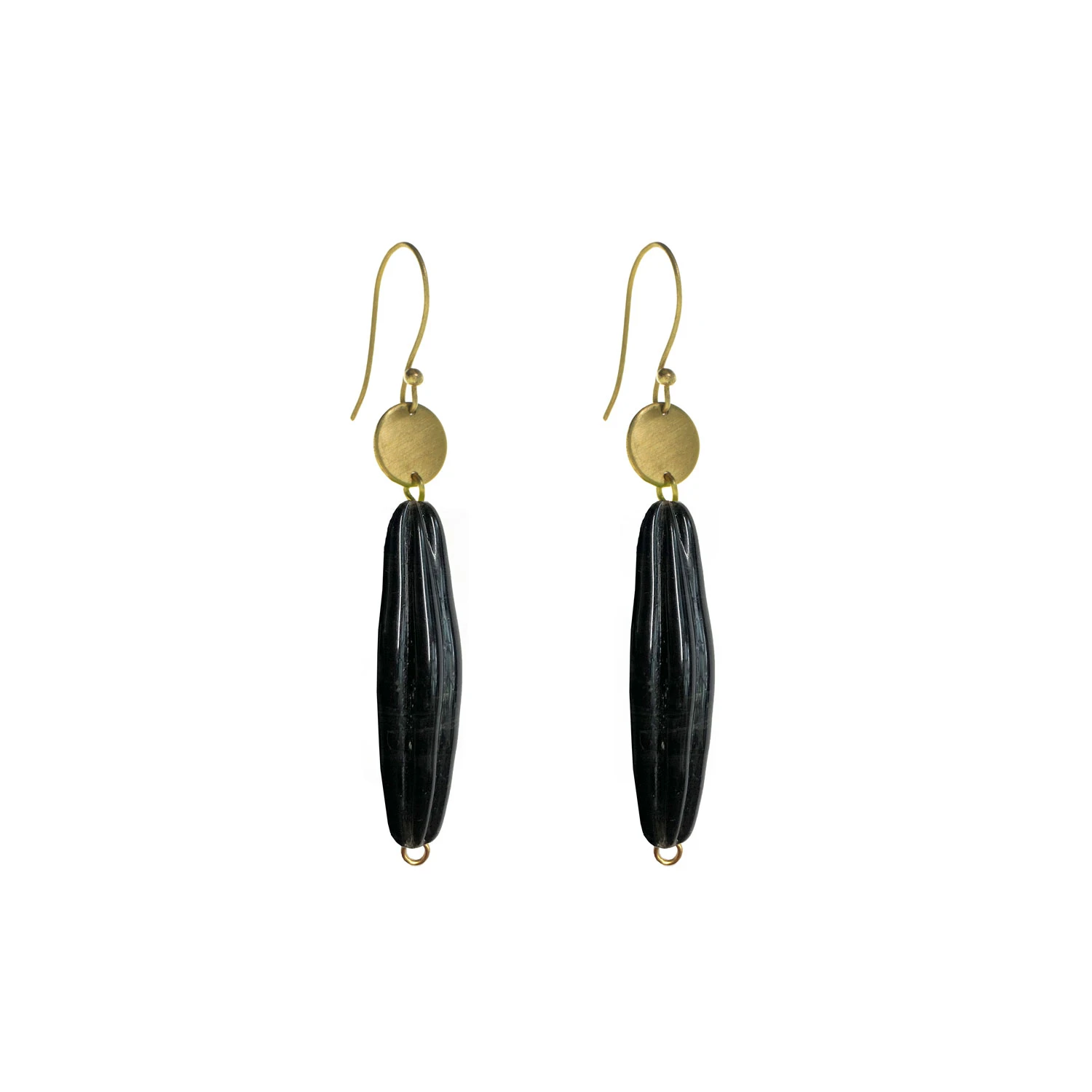 Materials: Black recycled glass beads and hypoallergenic brass earring hooks.