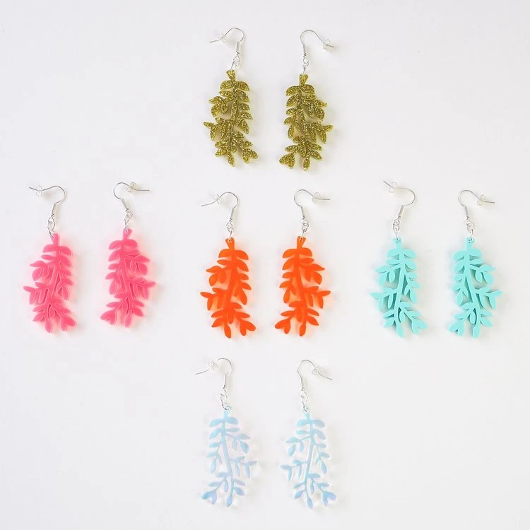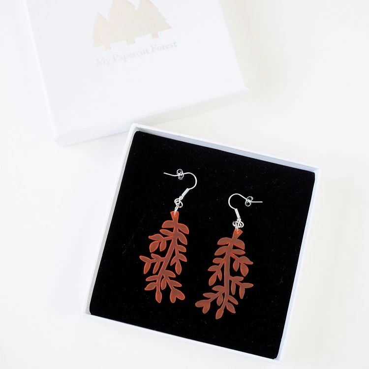 These stunning leaf earrings from My Papercut Forest feature a laser-cut leaf design. The design has been cut from perspex acrylic and they have low nickel silver-plated hooks. These earrings are very light weight.