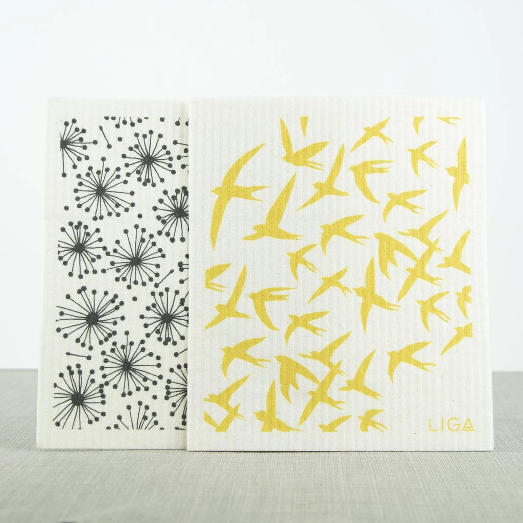 Super absorbent dishcloths/sponges in two designs: black dandelion and yellow swallows.