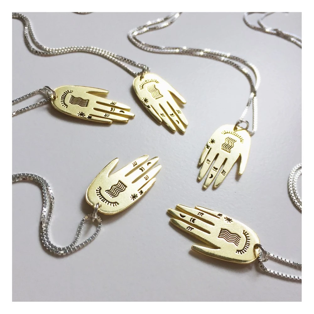 This lovely handmade palm necklace by Lima-Lima has been inspired by palmistry. The pendant is made of brass that has been treated with anti-tarnish resist to maintain its colour. The chain is an 18″ sterling silver box chain and the necklace comes in a cotton jewellery bag.
